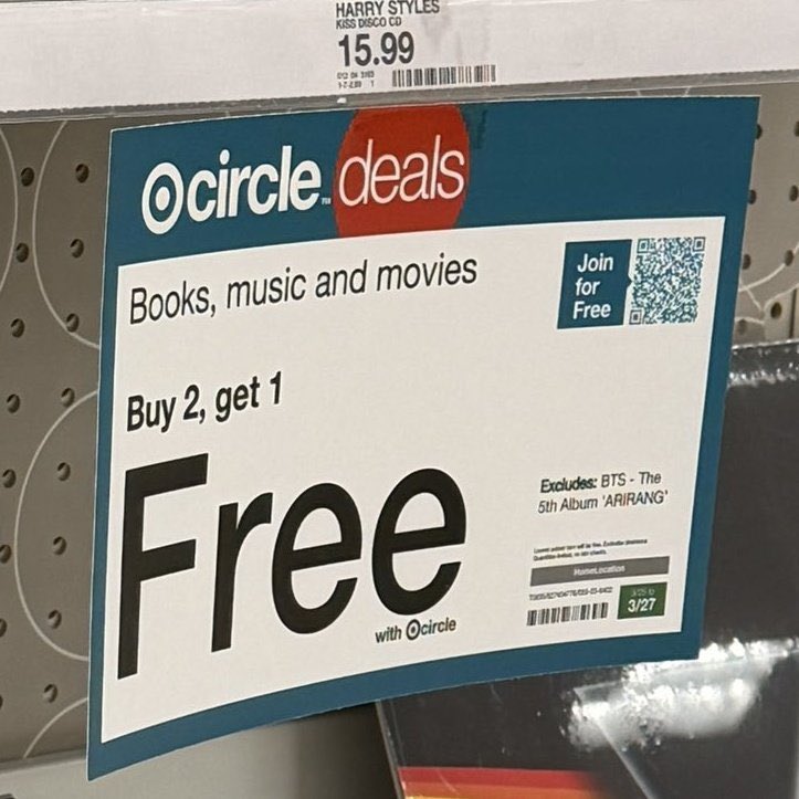 🚨 #BREAKING Target has a discount and a free deal “Buy 2 get 1 free” for #HARRYSTYLE’s new album which excludes #BTS “ARIRANG” on this free deal showing the High Global demand of #BTS’ new album has!!!V