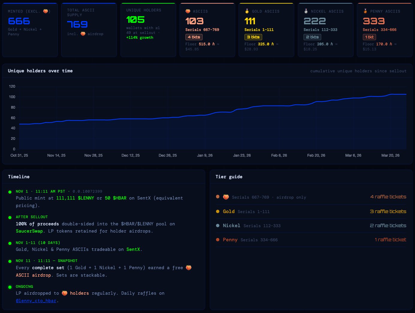 (͠≖ ͜ʖ͠≖)つ $lenny asciis unlock raffles every day across both #hedera & #xrpl, with over 300 prizes distributed to holders over the last 4 months 🏆