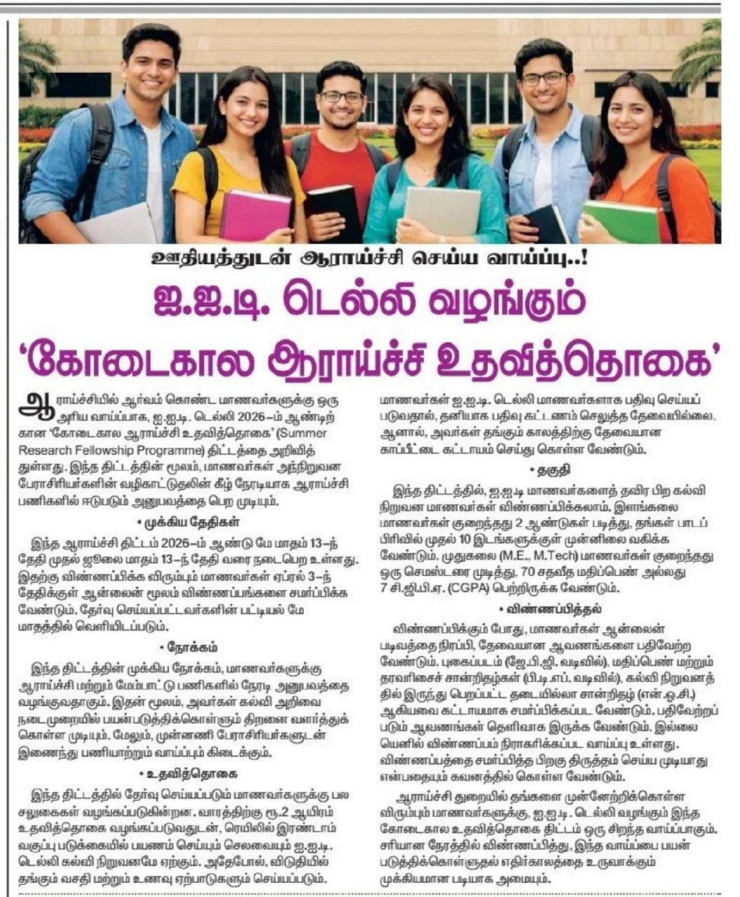 🎓 மாணவர்களுக்கான வாய்ப்பு: ஐ.ஐ.டி. டெல்லி வழங்கும் ‘கோடைகால ஆராய்ச்சி உதவித்தொகை’. ஐ.ஐ.டி. அல்லாத பிற கல்லூரி மாணவர்களும் விண்ணப்பிக்கலாம்.