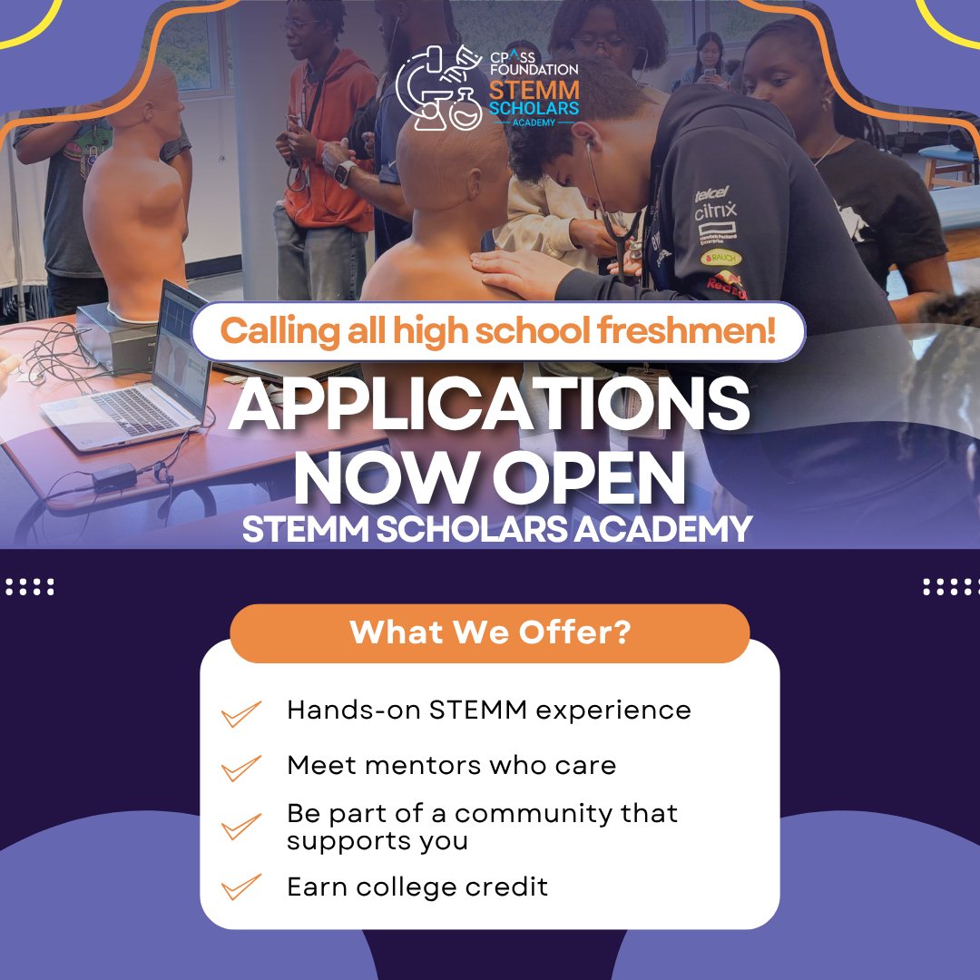 CPASS Foundation @cpassfoundation · Nov 7, 2025 Are you a high school freshman interested in Science, Tech, Engineering, Math or Medicine? Apply to our STEMM Scholars Academy! Visit: hubs.la/Q03SgMrG0 to learn more/apply! - #StemmScholarsAcademy #Summerprogam #HighSchoolProgram #Highschoolers #STEMProgram 15