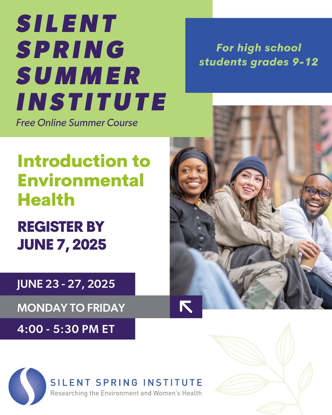 Silent Spring Inst @SilentSpringIns · Apr 11, 2025 We are excited to launch our new Silent Spring Summer Institute, a free virtual program for high school students interested in learning about environmental health. Register by June 7th: shorturl.at/4cxxs #SilentSpringInstitute #EnvironmentalHealth #HighschoolProgram 1 71