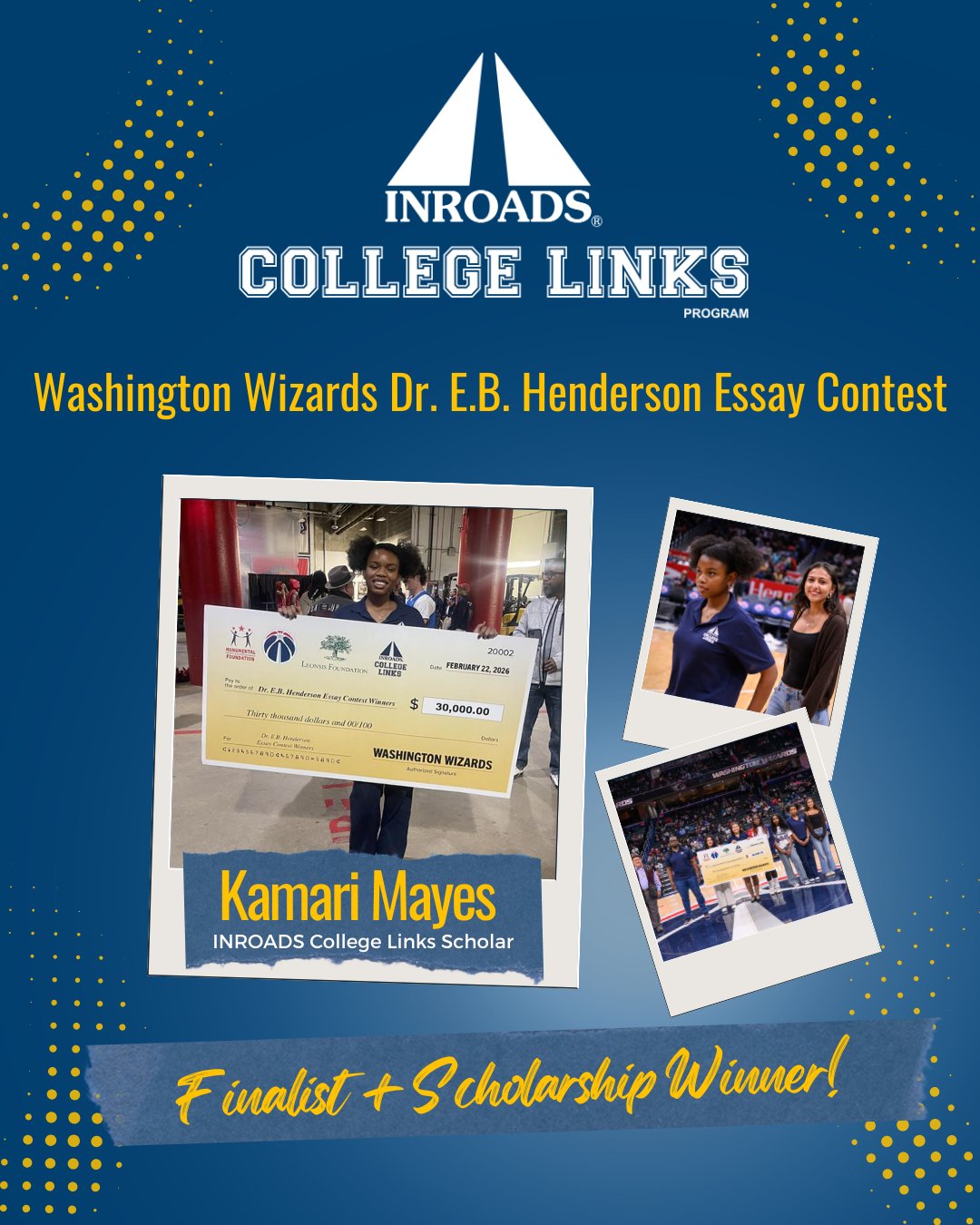 INROADS, Inc. @INROADS · Mar 11 Shoutout to INROADS College Links Scholar Kamari Mayes! 👏 As a finalist in the @WashWizards Dr. E.B. Henderson Essay Contest, Kamari earned a $2,500 scholarship toward her future education! #HighschoolProgram2 22