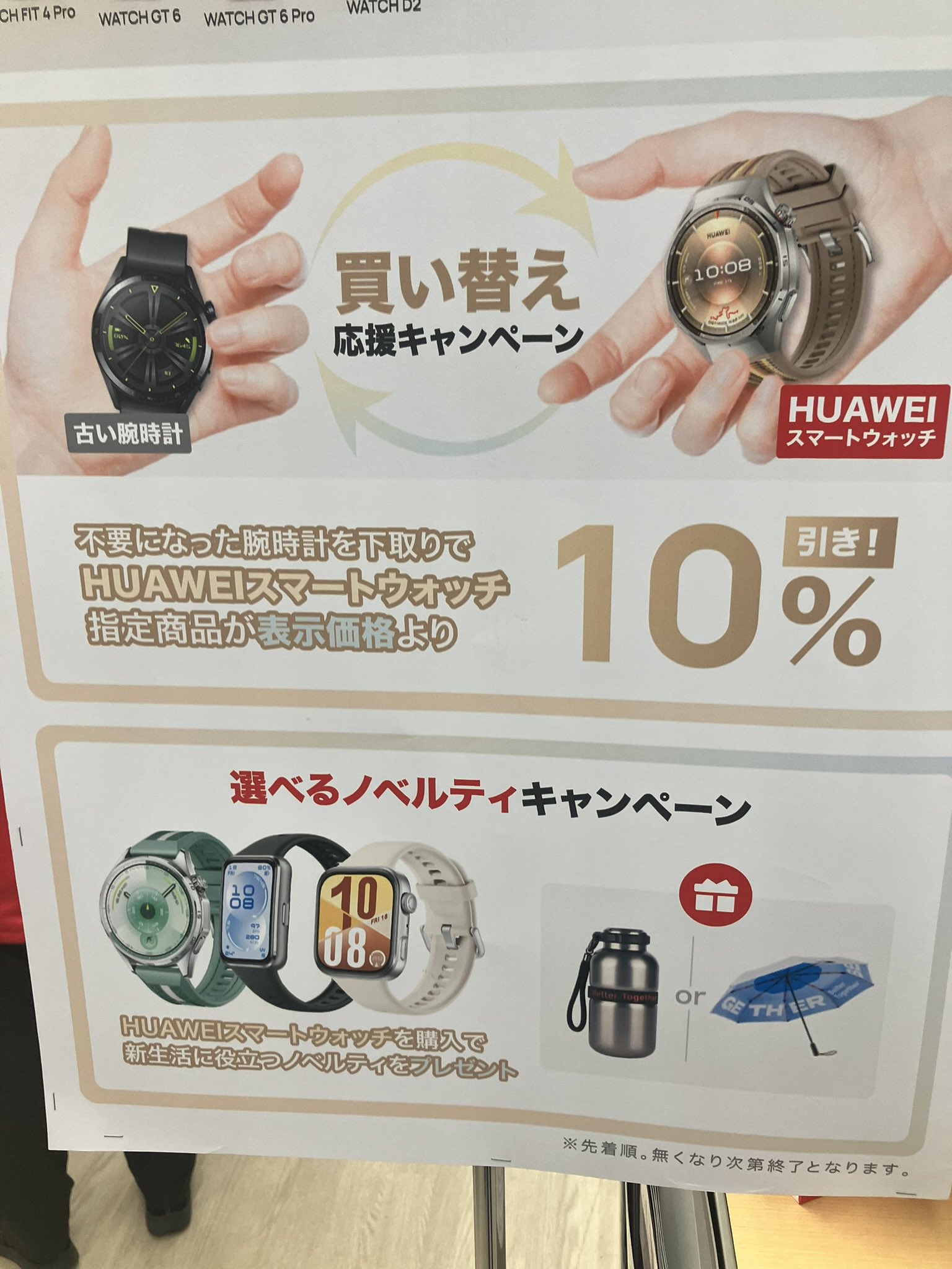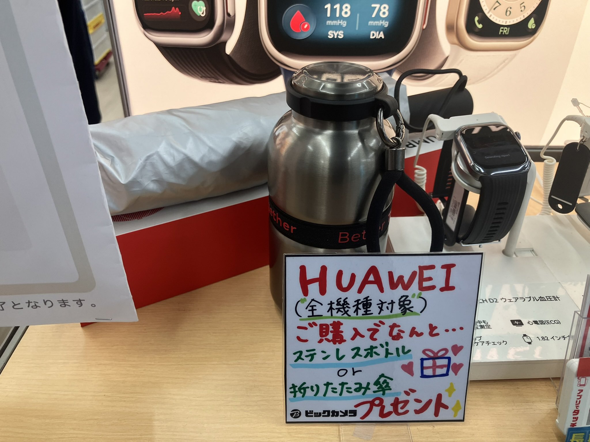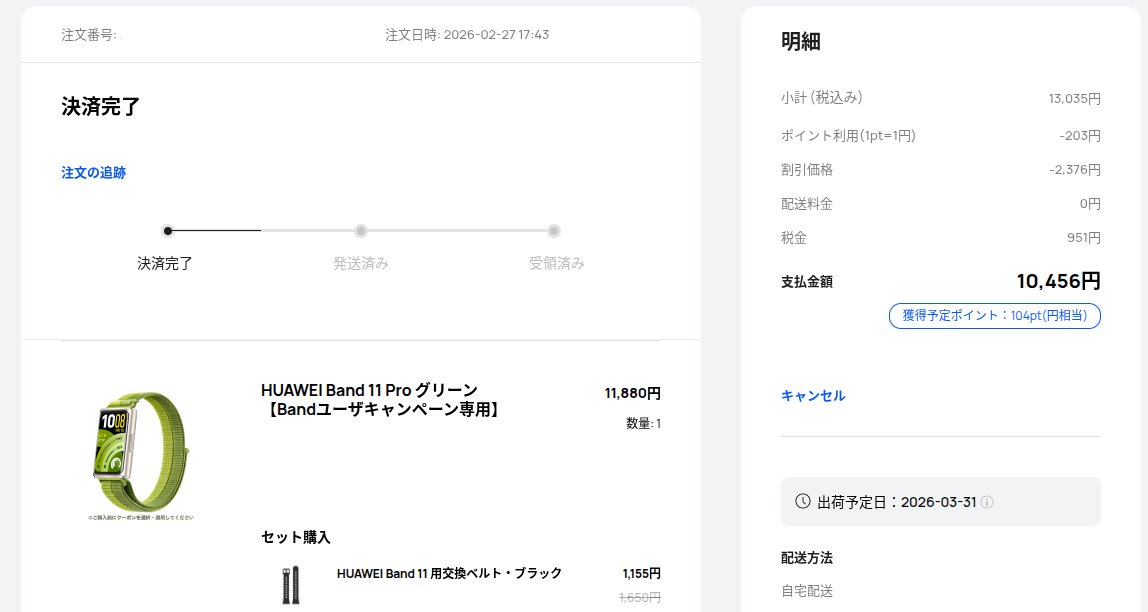 年末ビックシム契約して10000万ポイント貰ったの思い出して最新スマートウォッチ一昨日でたばかりのHuaweiBand11Pro買っちゃったポイント全部使ったら1500円で買えてめちゃくちゃラッキーでしたキャンペーンで折りたたみ傘貰えましたファーウェイさんありがとう