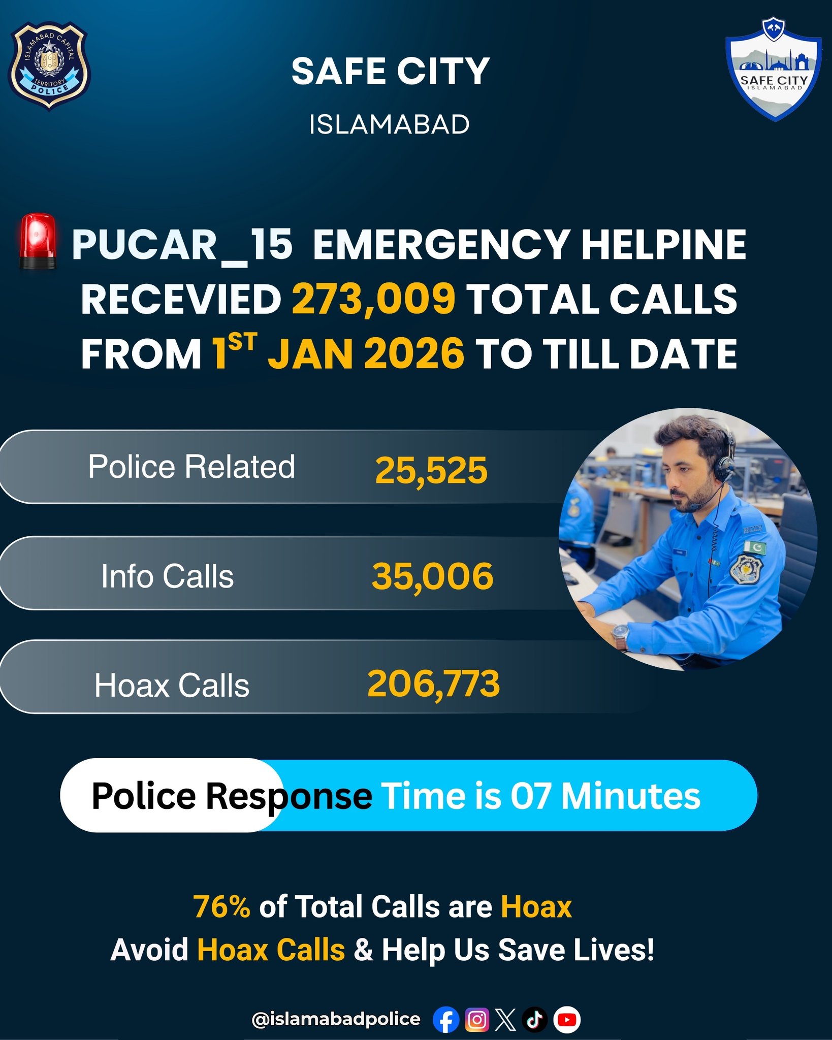 اسلام آباد پولیس کی ایمرجنسی ہیلپ لائن پکار 15 پر شہری کسی بھی ایمرجنسی کی صورت میں پولیس کی فوری مدد حاصل کر سکتے ہیں۔