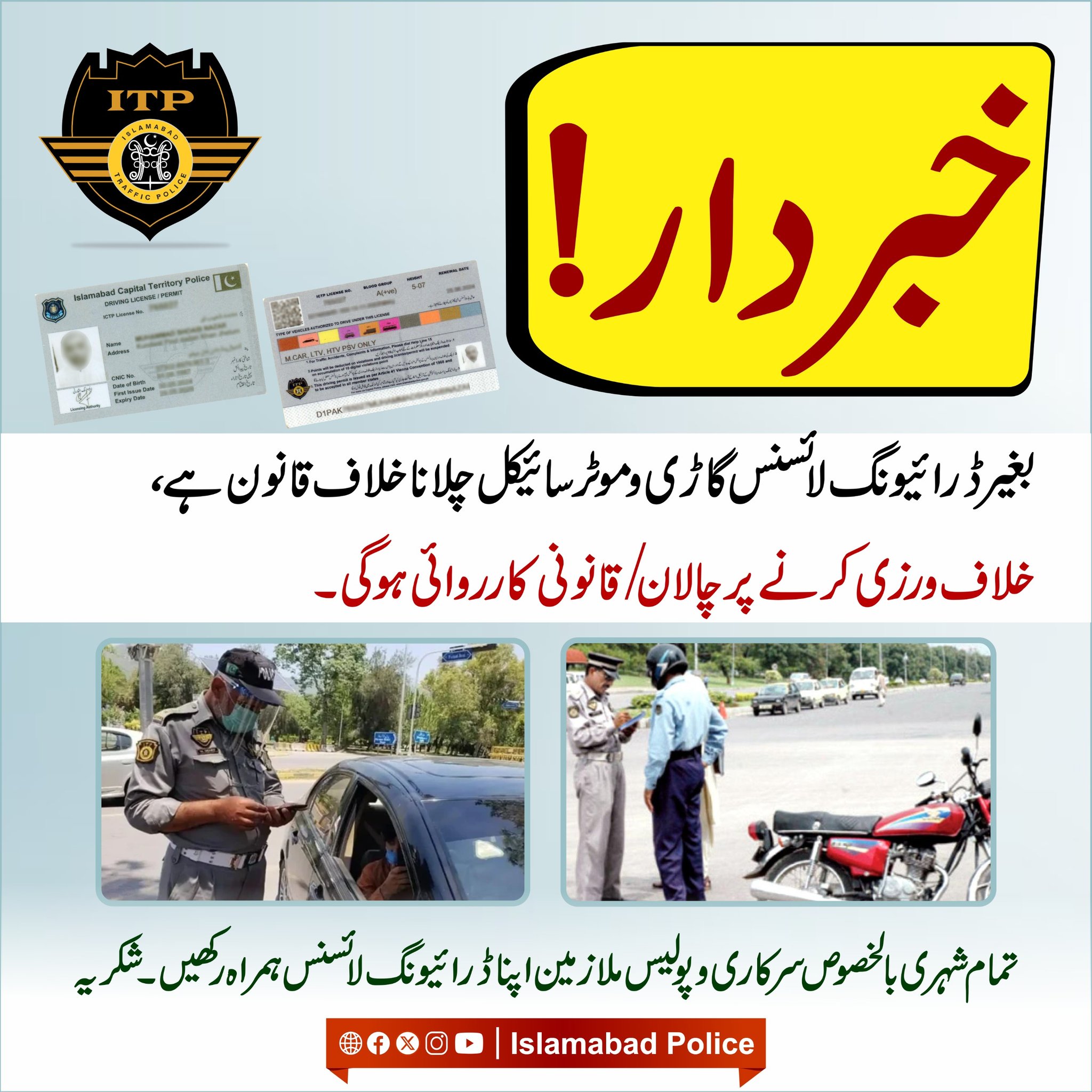 ٹریفک قوانین کی خلاف ورزی کرنے والے ہر شہری کے خلاف بلاتفریق کارروائی۔ تمام سرکاری ملازمین و پولیس افسران بھی اپنا ڈرائیونگ لائسنس ہمراہ رکھیں۔