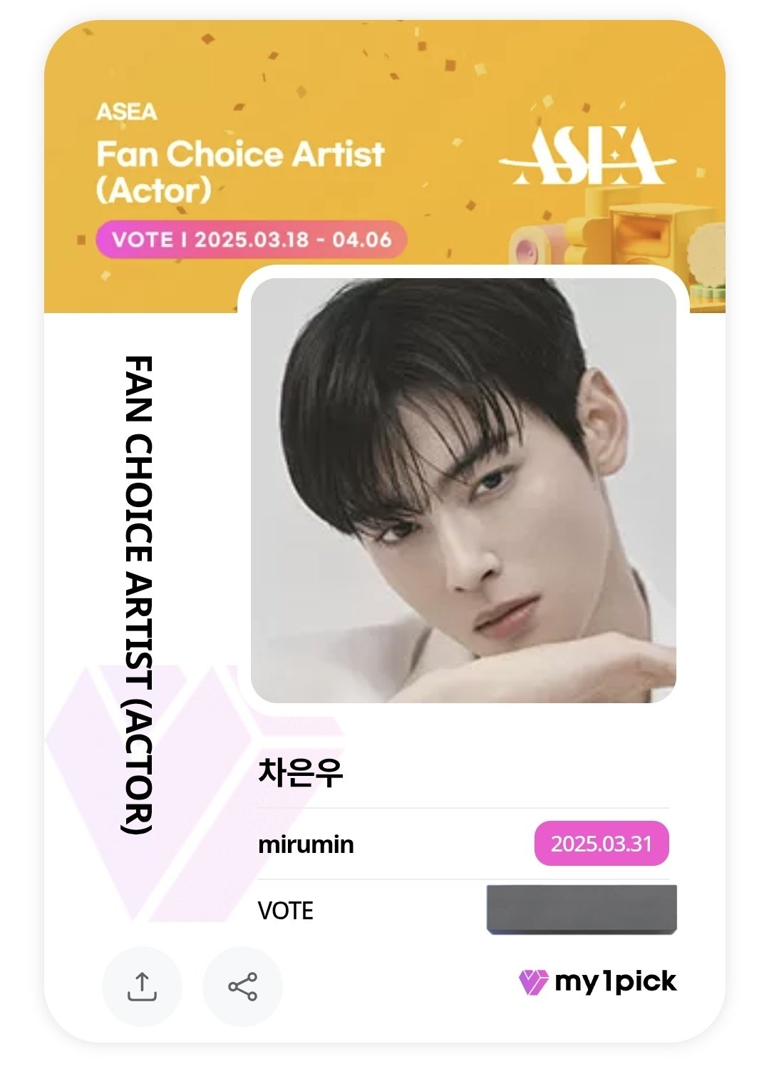 miru-min30 ᕱ⑅ᕱ゙ @mirutounutan · Mar 31, 2025 ASEA 2025 Fan Choice Artist (Actor) #MY1PICK #IDOLCHAM #PODOAL ウヌくんに投票完了です #차은우 #CHAEUNWOO #チャウヌ 1 1 309