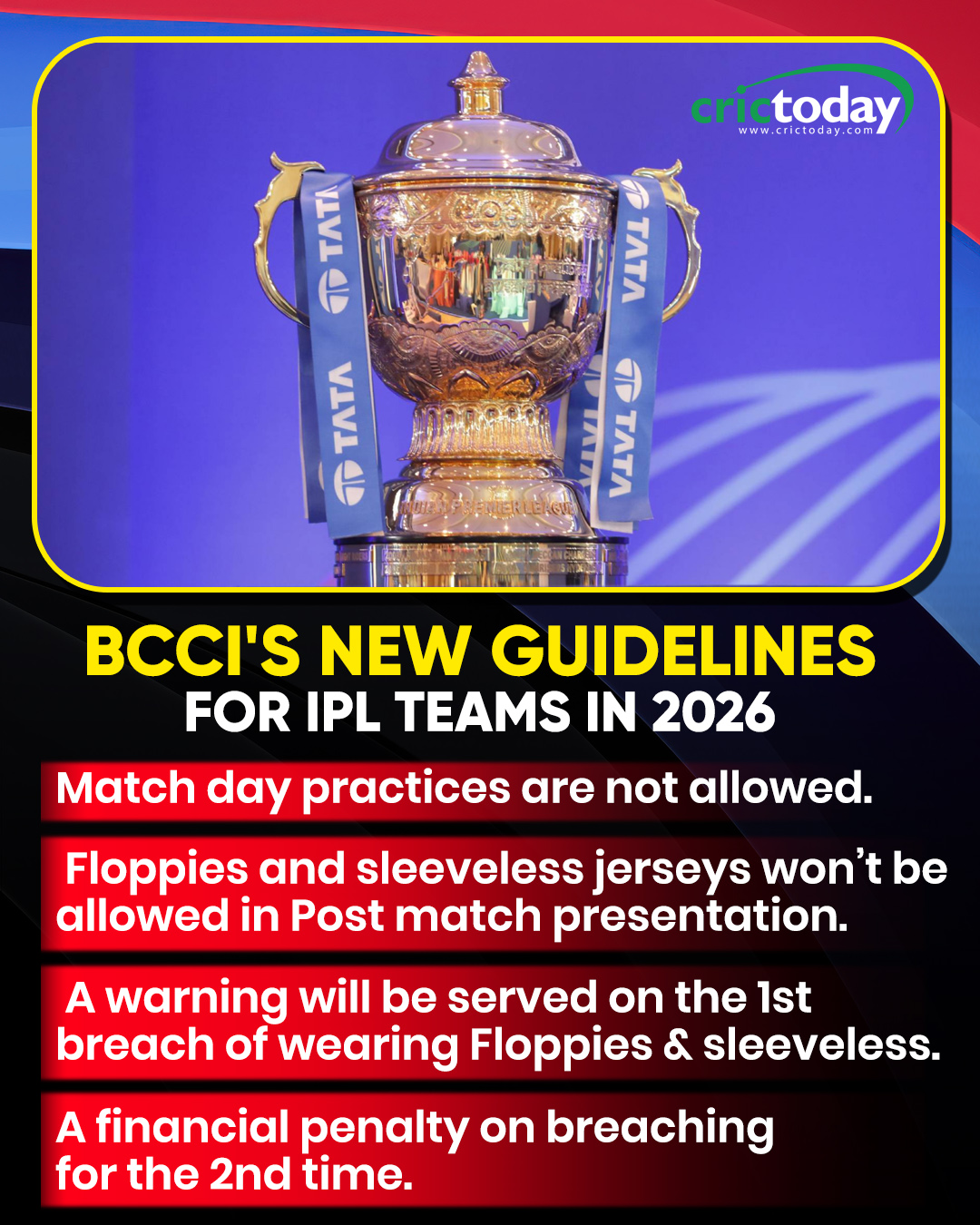 From hmtvlive.comIPL 2026: The Board of Control for Cricket in India (BCCI) has expanded its operational guidelines for this season, introducing stricter regulations, including a complete ban on match-day practice...