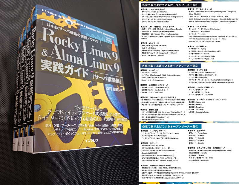 [IT] 本書は、Linuxを学ぶ本ではなく、Rocky Linux 9やAlmaLinux 9上で様々なオープンソースのサービスを構築できるようになる本です。今回は、なんと696ページもあります。生成AI、音声認識AI、物体認識AI、GPU、JupyterHub、LDAP認証等、現場で使える一冊です。 amazon.co.jp/dp/B0D9W75PWC #構築 #IT
