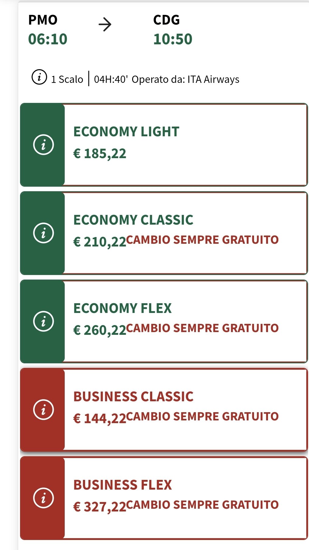 strana politica tariffaria di #ITA Airways che fa pagare +50% la tariffa Economy Classic rispetto alla Business Classic, e quest'ultima ti dà molto di più (doppio bags in stiva, priorità imbarco, fast track sicurezza, posto centrale vuoto...)