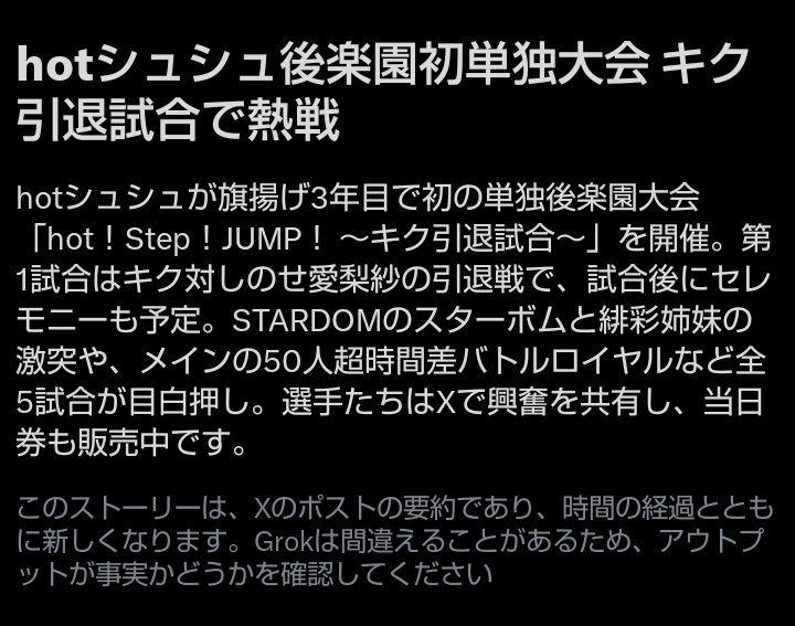 ラ ン バ @JACKguillotine_ · 6h なんと本日の興行が時間差で昨日の話としてニュースに載っている! 私だけだろうか🤔 次の試合は4.5㈰SAKURA祭り 引用元を参照下さい!! #prhot #igniteJ Ignite(イグナイト)【公式】アマチュアプロレスリング @Ignite_aw · 10h hotシュシュ後楽園ホール大会 夢の後楽園ホール 提供試合ありがとうございました! 【活動予定】 🌸おでかけプロレス in SAKURA祭り 4月5日(日)開始14:30hot-c.pro/info/6660307G 🔥#Ignite 大会 4月19日(日)開始18:0hot-c.pro/calendar/66084…EE 📌レッスル武闘館 ◆予約不要 ◆入場無料※投げrR4 5 7 777