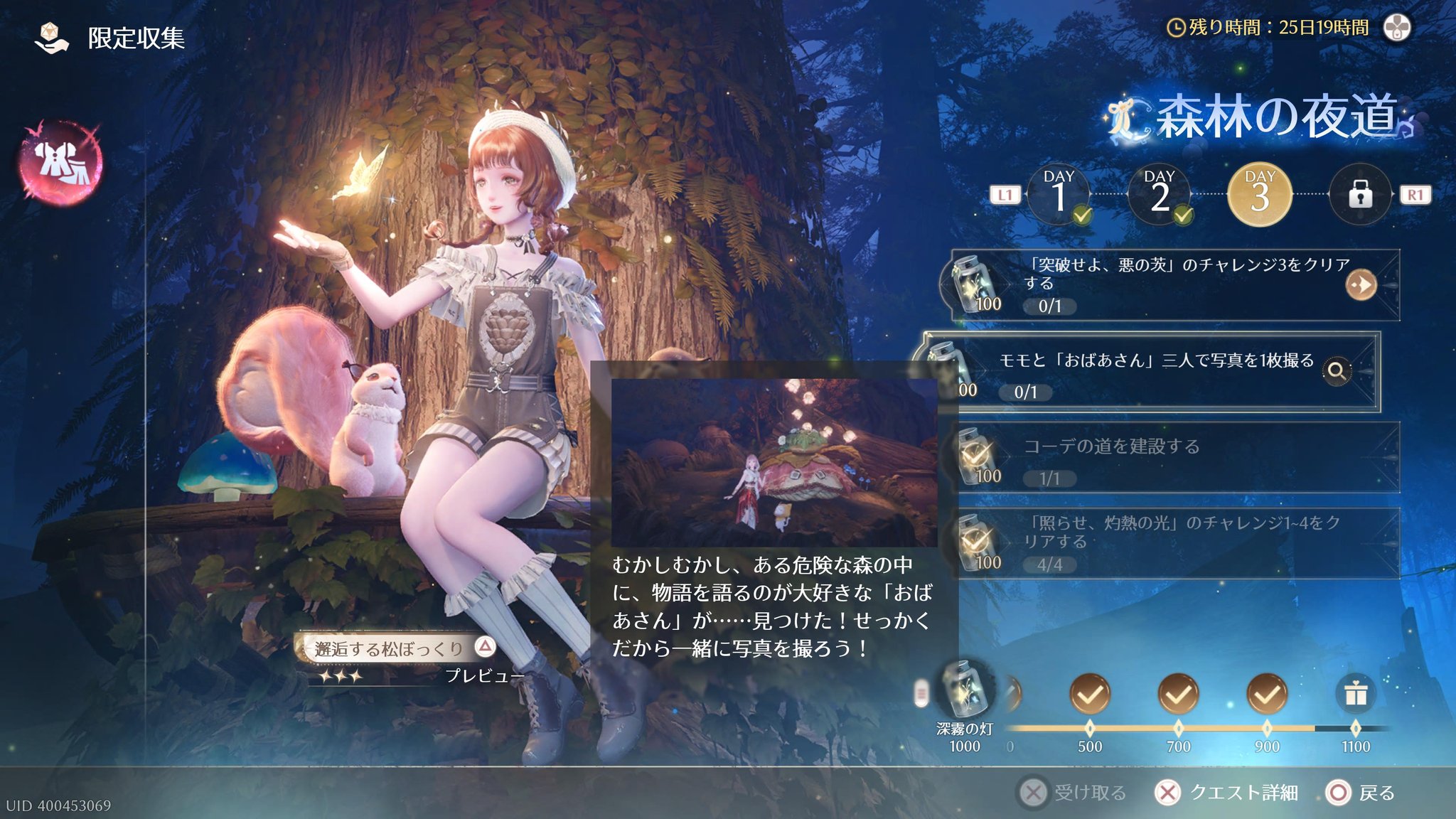 HABANERO3 @habanero330 · 31m 森林の夜道3日目のクエスト・ミッション 「モモと『おばあさん』三人で写真を1枚撮る」 おばあさんの場所 判定枠は出ませんでしたがクリアになりました 「モモ」を入れて「3人」で撮影なのでご注意を☝️ #インフィニティニキ #InfinityNikki 5 18