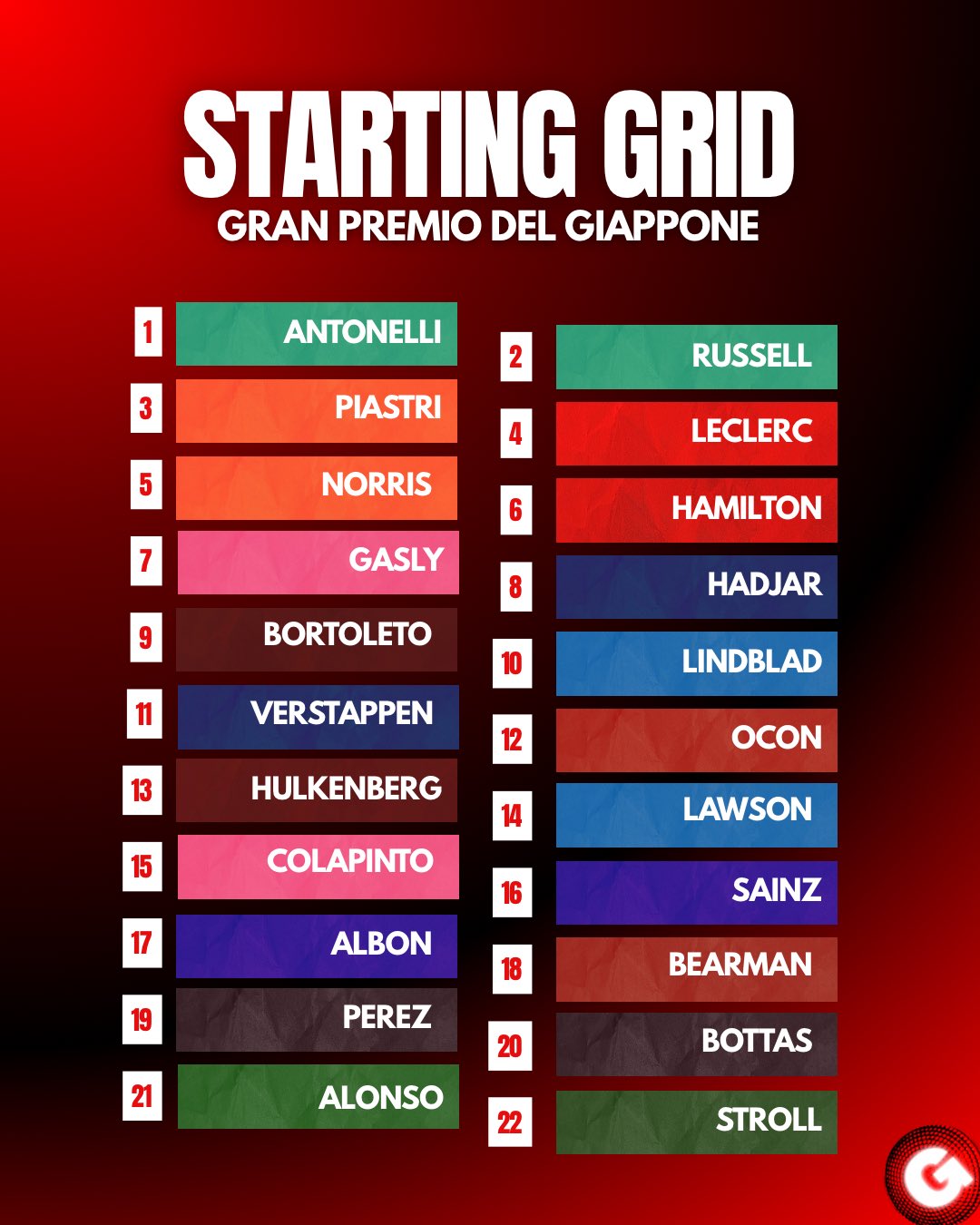 ECCO LA GRIGLIA DI PARTENZA DEL #JapaneseGP !!