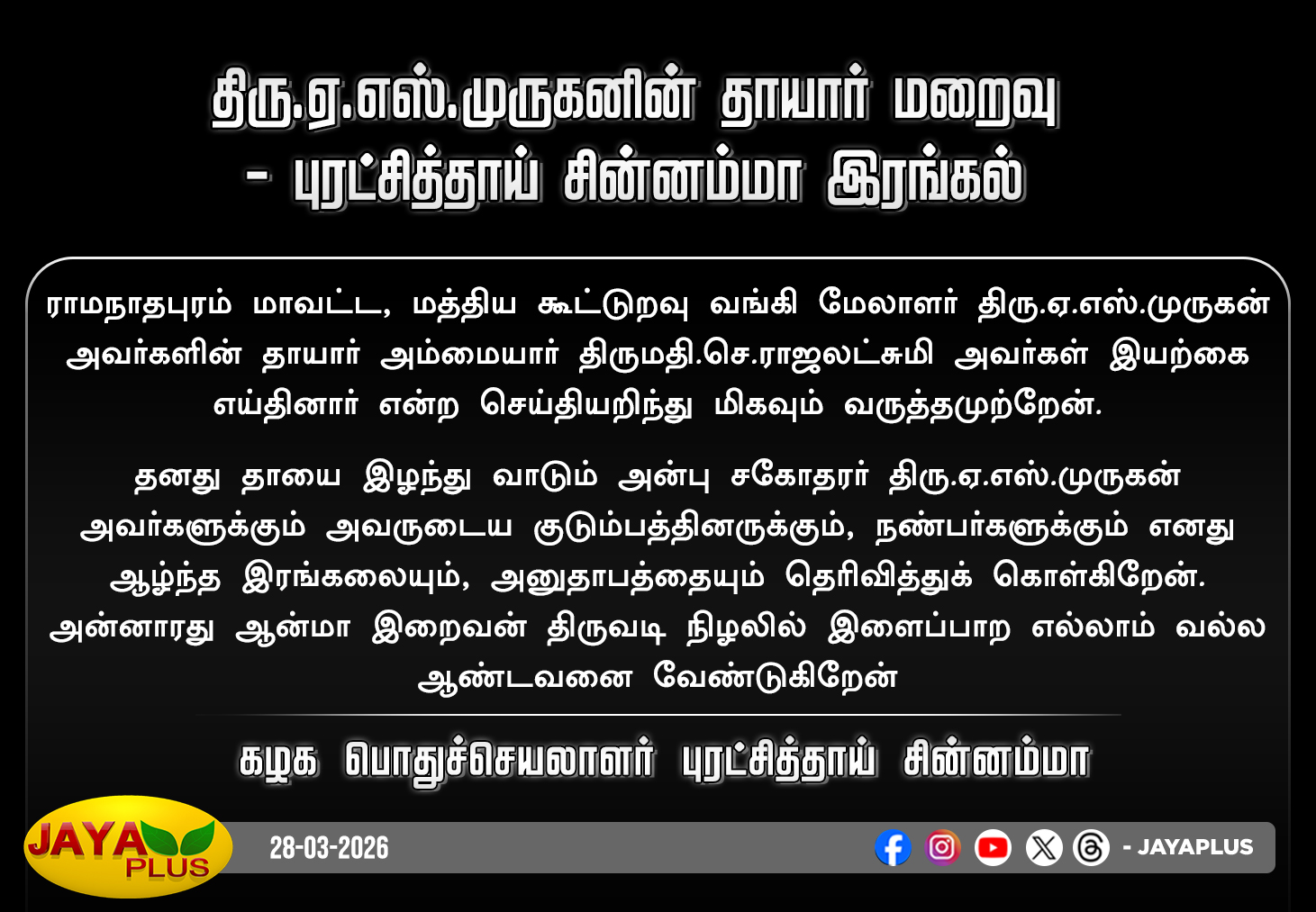 ராமநாதபுரம் மாவட்ட, மத்திய கூட்டுறவு வங்கி மேலாளர் திரு.ஏ.எஸ்.முருகனின் தாயார் திருமதி.செ.ராஜலட்சுமி மறைவு - அனைத்திந்திய புரட்சித்தலைவர் மக்கள் முன்னேற்றக் கழக பொதுச்செயலாளர் புரட்சித்தாய் சின்னம்மா இரங்கல்