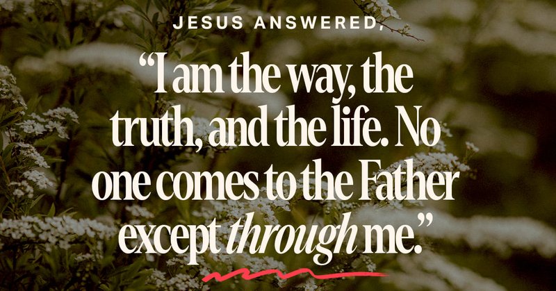 Jesuo diris al li: Mi estas la vojo kaj la vero kaj la vivo; neniu venas al la Patro krom per mi.