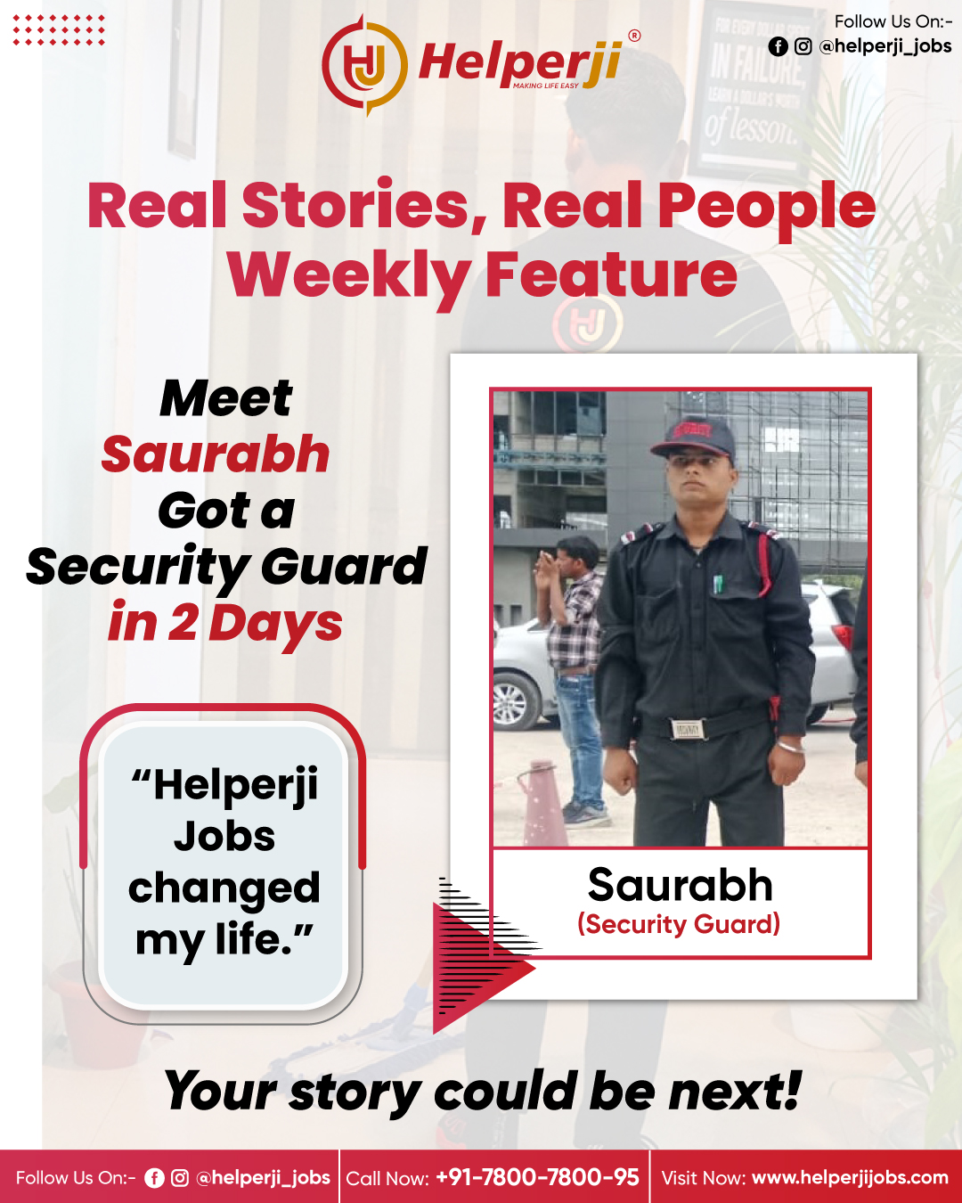 Saurabh got a **Security Guard job in just 2 days** with Helperji Jobs. 👮♂️