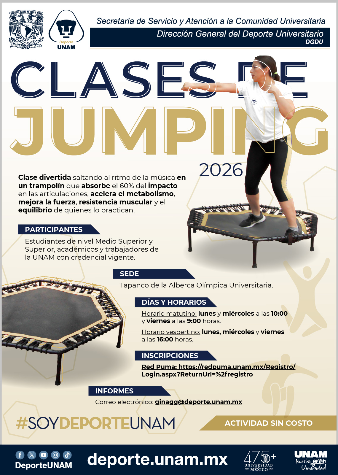 Deporte UNAM @DeporteUNAM · 4d ✨Clases de #Jumping✨🤸🏻♂️ 📌Tapanco de la Alberca Olímpica 👨💻 Inscripciones: RED Predpuma.unam.mx/Registro/Login…2Msmd ℹ️ Informes: ginagg@deporte.unam.mx #SoyDeporteESuIa 45