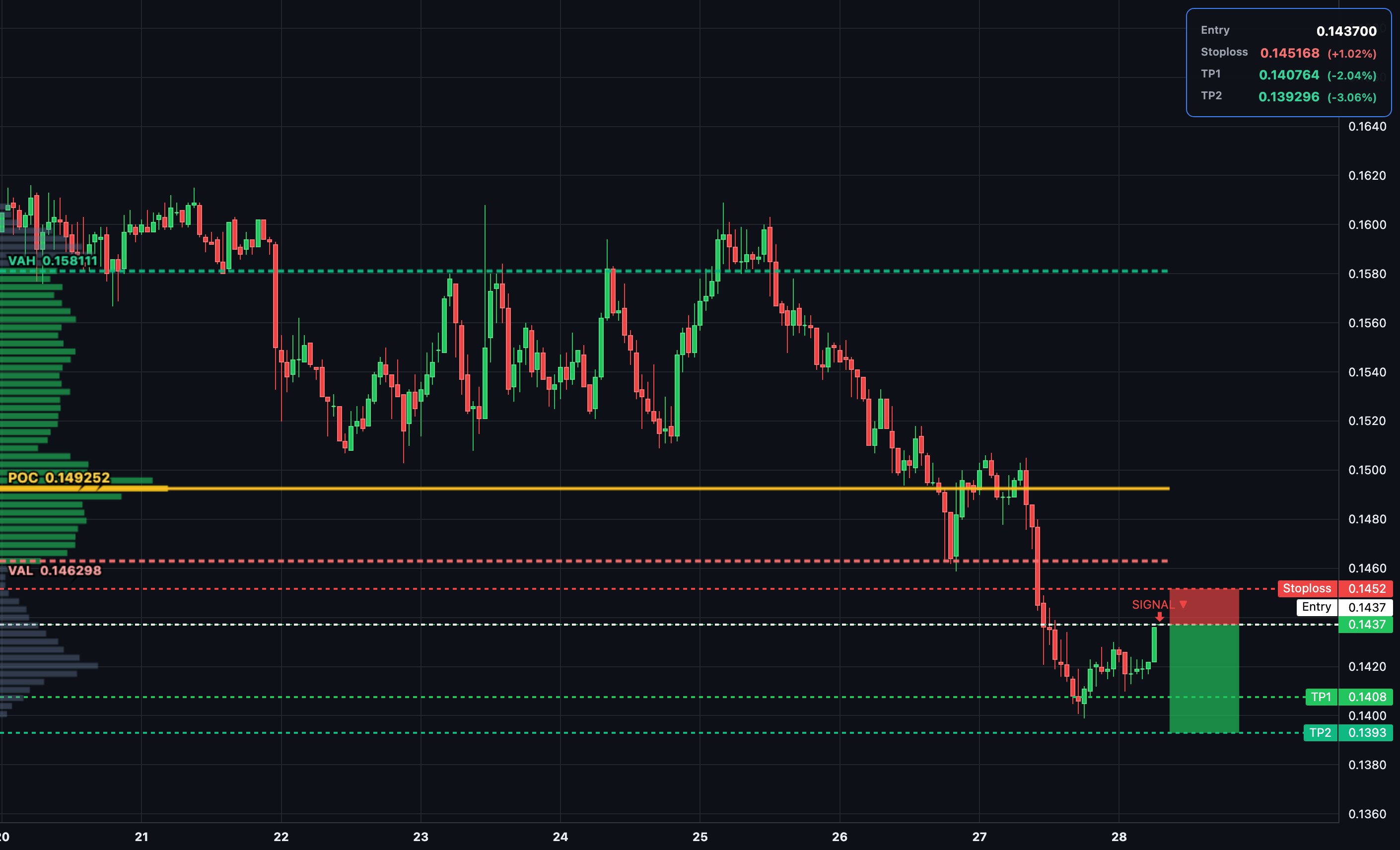 $JUP short triggered at 0.1437 with SL above VAL 0.1463. Price rising into the Value Area while delta falls — clear seller distribution. Targeting a move down to POC 0.1492 then lower to TP2 for strong auction rotation. #Jupiter#Solana#Crypto#Trading#Altcoins