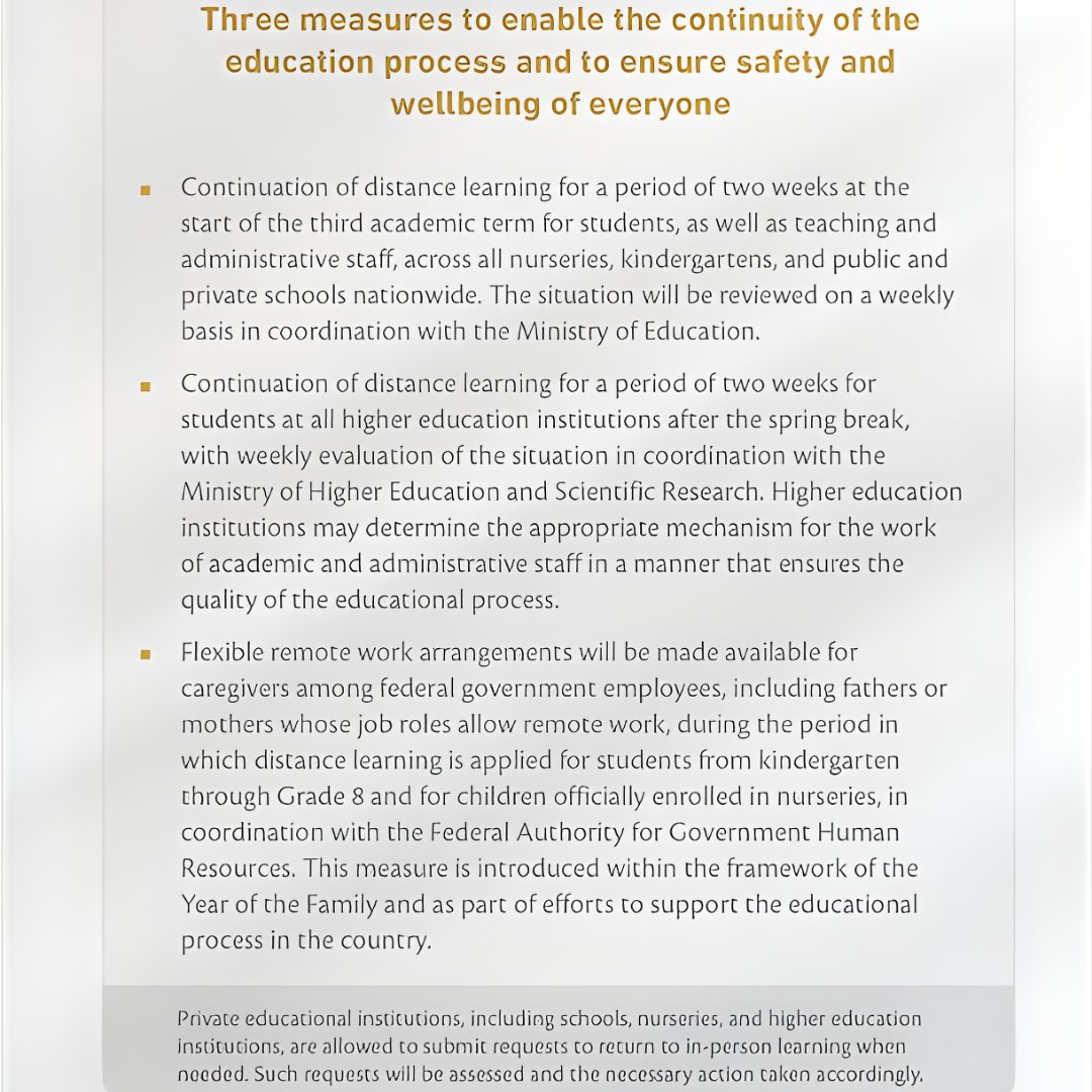 KHDA also emphasises that any institution seeking to resume on-site learning must submit a formal request ailed justifications. The final decision, issued by the Ministry of Education, will prioritise the safety of the educational community in Dubai.