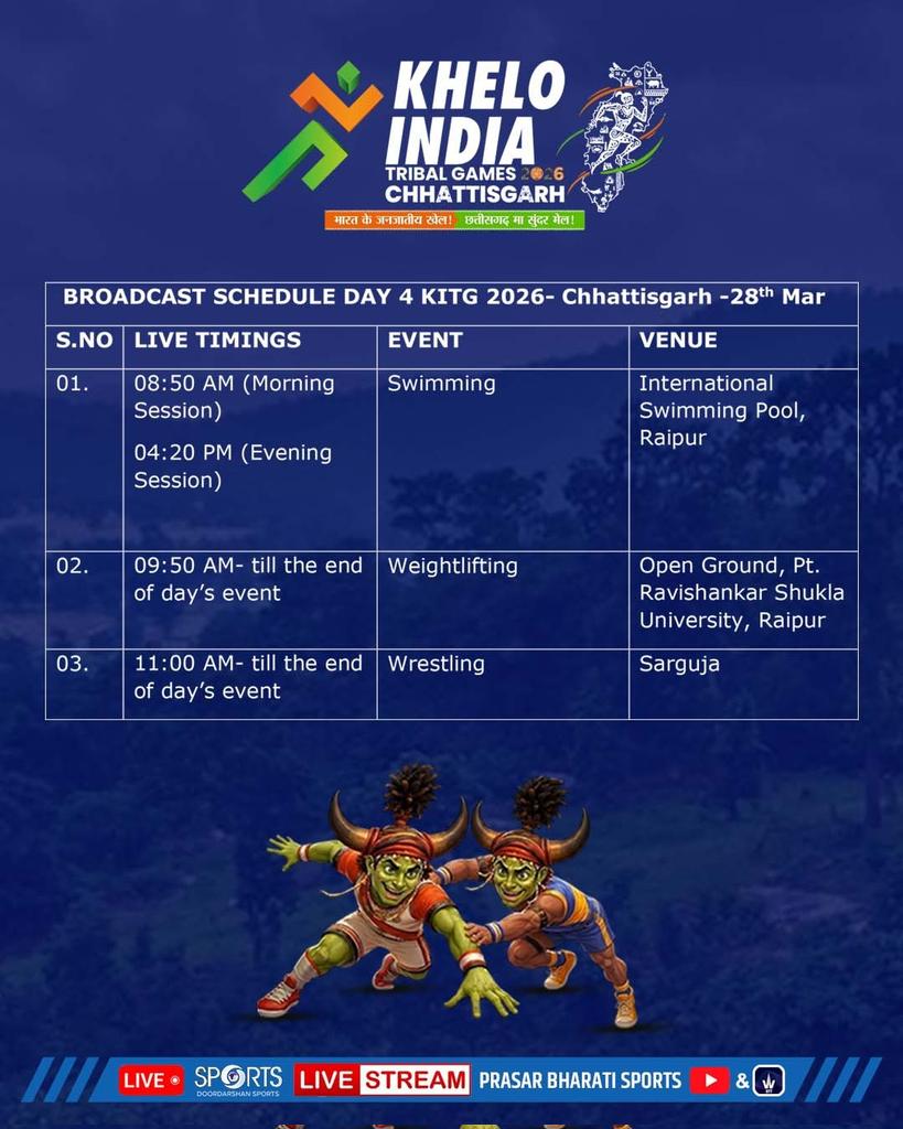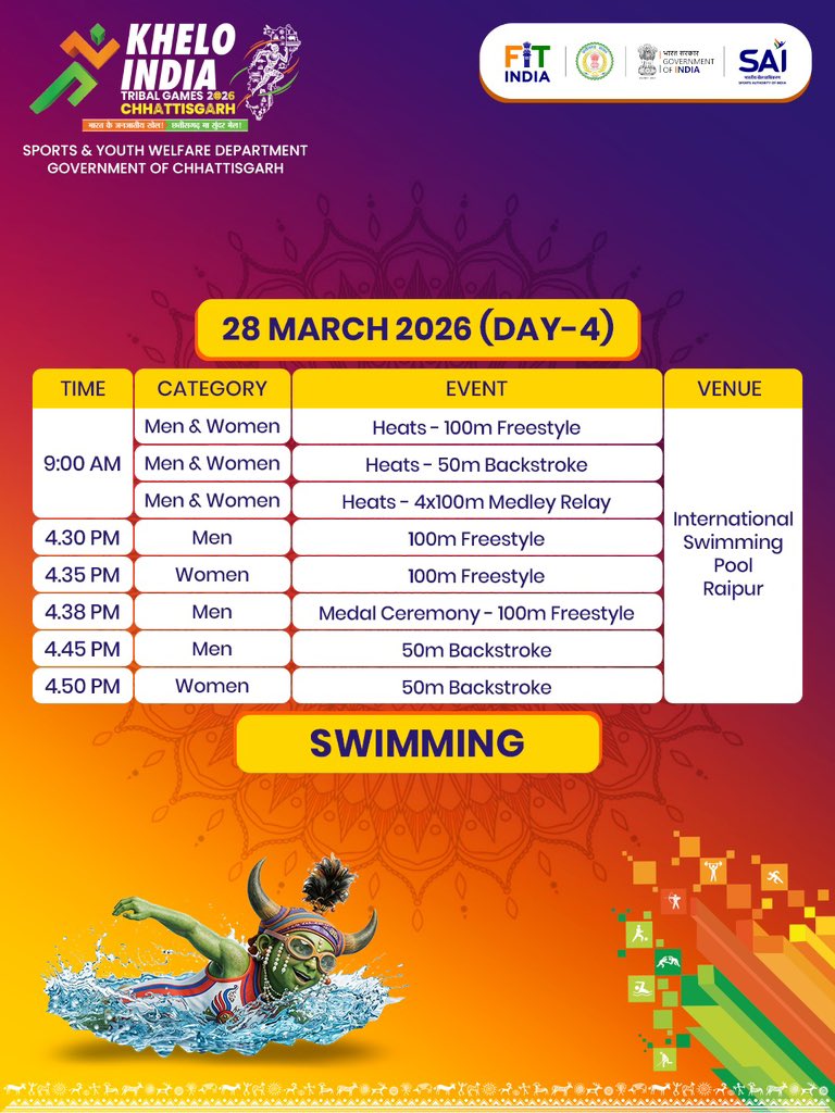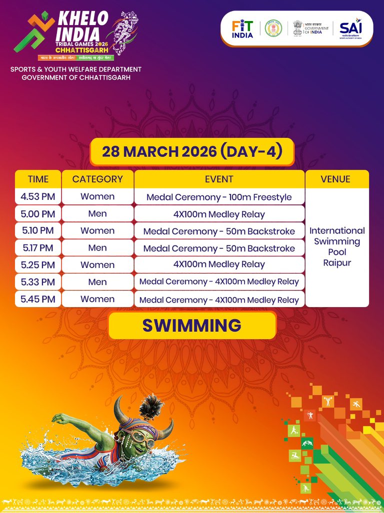 खेलो इंडिया ट्राईबल गेम्स के तीसरे दिन आज #छत्तीसगढ़ के तीन तैराकों ने पदक हासिल किए हैं। राज्य की अनुष्का भगत ने महिला वर्ग की पचास मीटर तैराकी की ब्रेस्टस्ट्रोक स्पर्धा में रजत और निखिल खलखो ने इसी स्पर्धा के पुरुष वर्ग में कांस्य पदक जीता है। #KITG2026