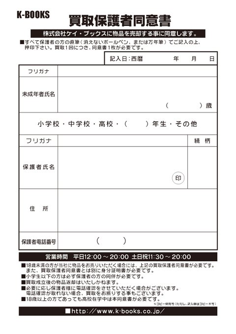 買取では必ず身分証が必要になります。 ※有効期限内。コピー不可。現在住所記載のもの。 18歳未満(高校生、高校生以下)の方は身分証+保護者同意書が必要です。枠内全て保護者の方がご記入ください。