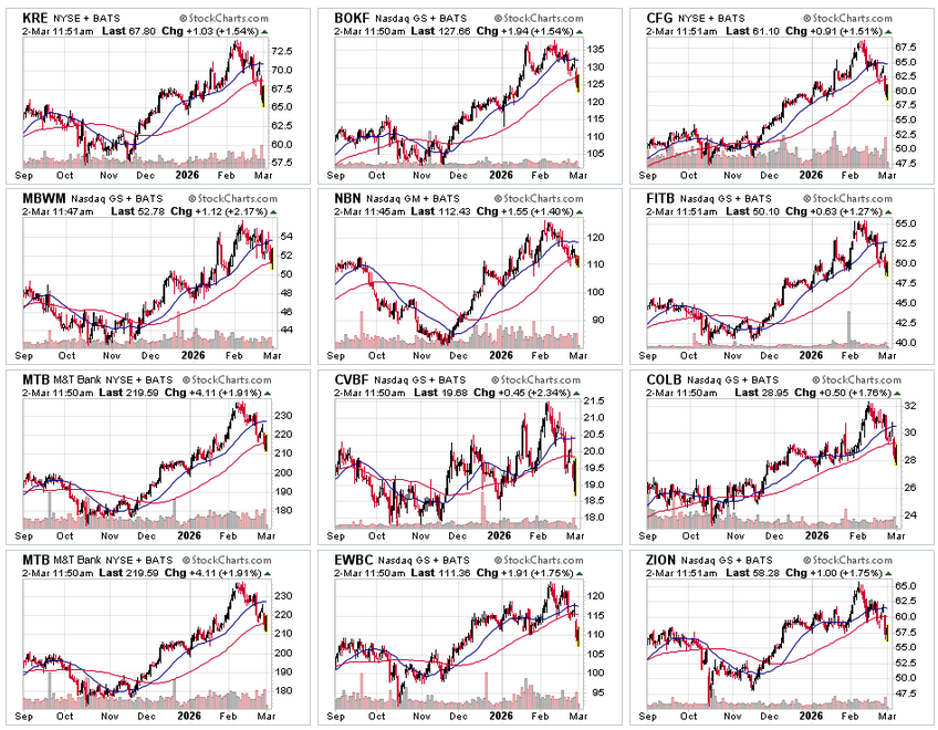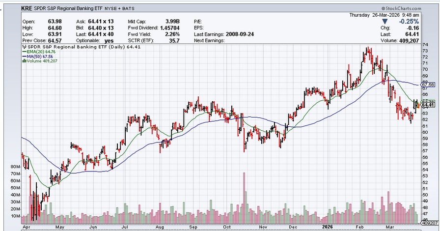 [2026-03-09] CrowdWisdom for #KRE Regional Banking ETF is testing key $63-65 support after a sharp pullback Limited fear signals from options suggest potential bounce Upside targets $66.50-$68.20 with stops at $63.50 Downside looks crowded but confidence is modest at 46%