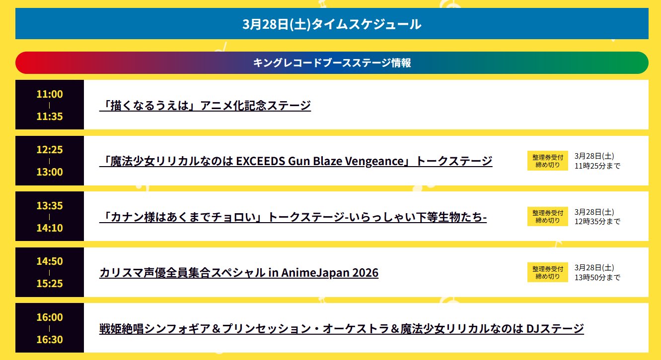 KAC/SB公式 @kac_officialhp · 17h / #AJ2026🗻 #キングレコード👑 ブース #KAC 作品🏋️ ステージラインナップ✨ \ 🦁11:00-11:35 「描くなるうえは」アニメ化記念ステージ 🦁12:25-13:00 「魔法少女リリカルなのは EXCEEDS Gun Blaze Vengeance」トークステージ 🦁13:35-14:10 「カナン様はあくまでチョロい」トー�16:00-16:30 戦姫絶唱シンフォギア&プリンセッション・オーケストラ& 魔法少女リリカルなのは Dking-cr.jp/animejapan/L8s3AjE 12 19 3.8K