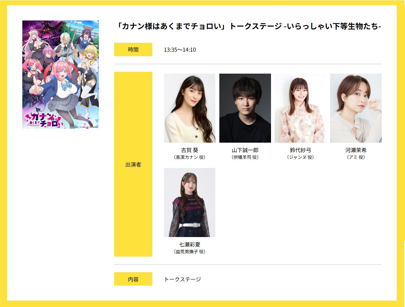 KAC/SB公式 @kac_officialhp · 14h / #AnimeJapan 2026🗻 #キングレコード ブース�� #KAC 作品ステージ情報💡 \ 😈13:35-14:10 「カナン様はあくまでチョロい」トークステージ -いらっしゃい下等生物たち- ��️登壇 #古賀葵 #山下誠一郎 #鈴代紗弓 #河瀬茉希 #七瀬彩夏 �kanachoro-anime.comFztVEe #カナチョロ #kanan_clG1tPN 6 14 3.1K