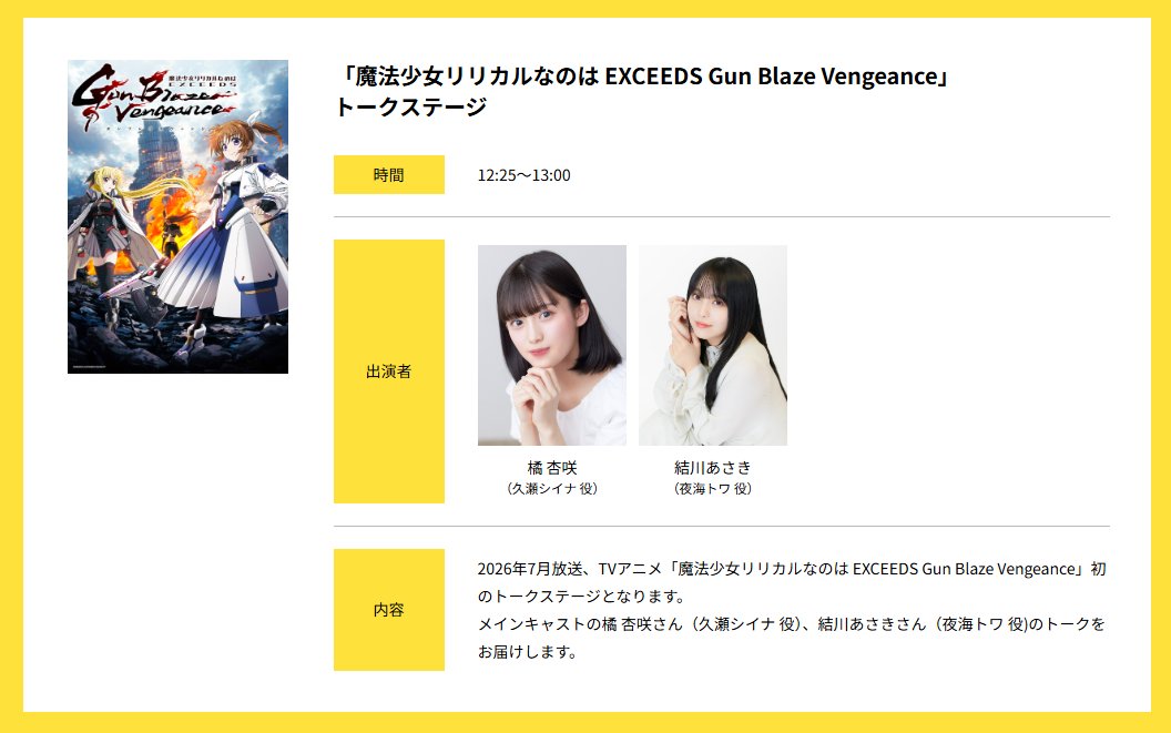 KAC/SB公式 @kac_officialhp · 15h / #AnimeJapan 2026🗻 #キングレコード ブース�� #KAC 作品ステージ情報💡 \ ✦12:25-13:00 「魔法少女リリカルなのは EXCEEDS Gun Blaze Vengeance」 トークステージ ��登壇 #橘杏咲 #結川あさき 🔗nanoha.comJYVGm #nanoha LTgl0 23 52 4K