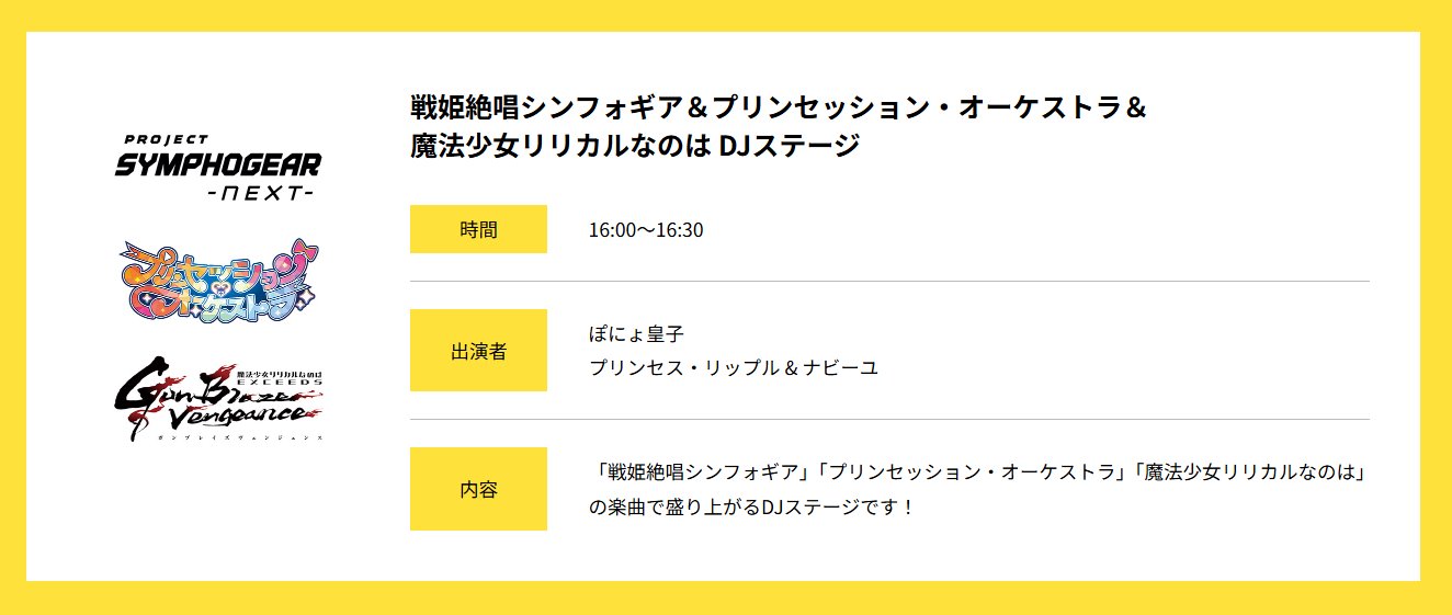 KAC/SB公式 @kac_officialhp · 11h / まもなくスタート🏃💨 \ #AJ2025🗻#キングレコード ブース👑 #KAC 作品イベントステージ📢 💎16:00-16:30 戦姫絶唱シンフォギア&プリンセッション・オーケストラ& 魔法少女リリカルなのは DJステージ 🎙️登壇 #ぽにょ皇子 #プリンセス・リップル #ナビーユ symphogear.com/news.htmlasymphogear.com/news.htmlananoha.com8ltv5eK0 #Symphogear #プリオケ #nanoha 5 10 2.6K