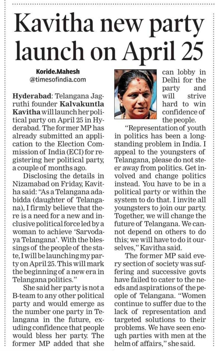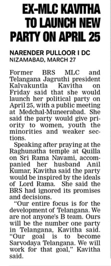 Kavitha New political party launch on April 25th.