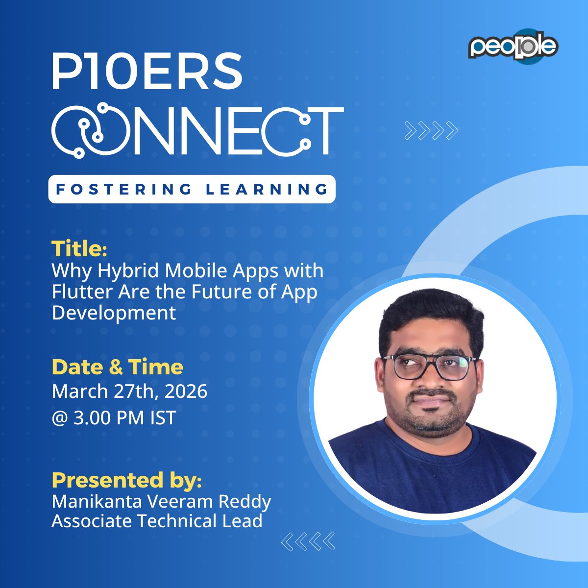 An interactive, powerful & knowledge-packed session from Manikanta Veeram Reddy on "Why Hybrid Mobile Apps with Flutter Are the Future of App Development” will be presented on March 27th, 2026, at 3.00 p.m. (IST).