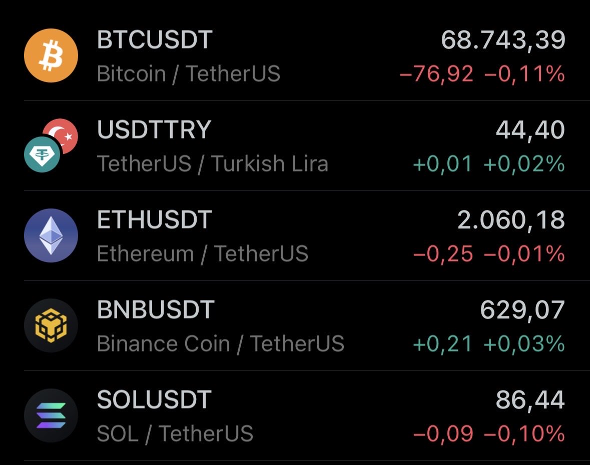 Kripto Paralar Düşüşte 🚨 70.000 $ üzerinde kalıcılık sağlayamayan Bitcoin olumsuz haberlerle birlikte 68.743 $ dolara geriledi. Anlık fiyatlar 👇 #Kriptopara #Bitcoin #BnYE