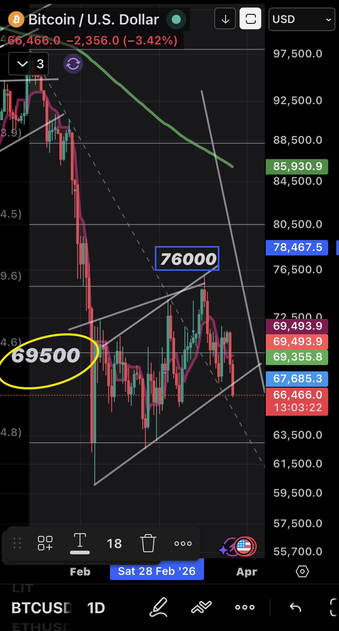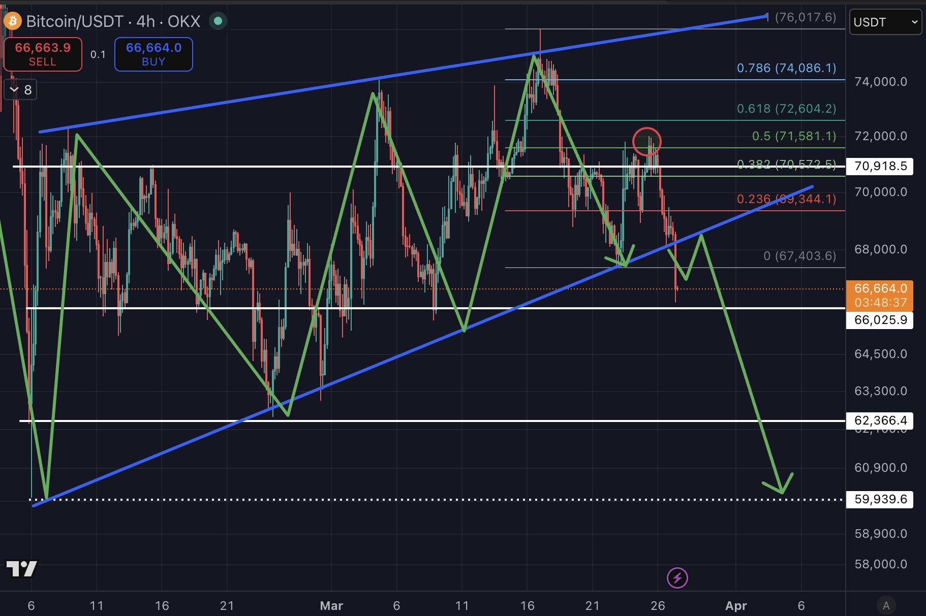 👇 $BTC de konuştuğumuz senaryo gerçekleşiyor. Kırılım geldi ve 66 desteğinden tepki aldık. Burada günlük kapanış gelirse ardından restest gelir ve formasyon hedefi olan 60k seviyelerine kadar bir düşüş yolculuğuna başlarız. #bitcoin #kriptoparaA