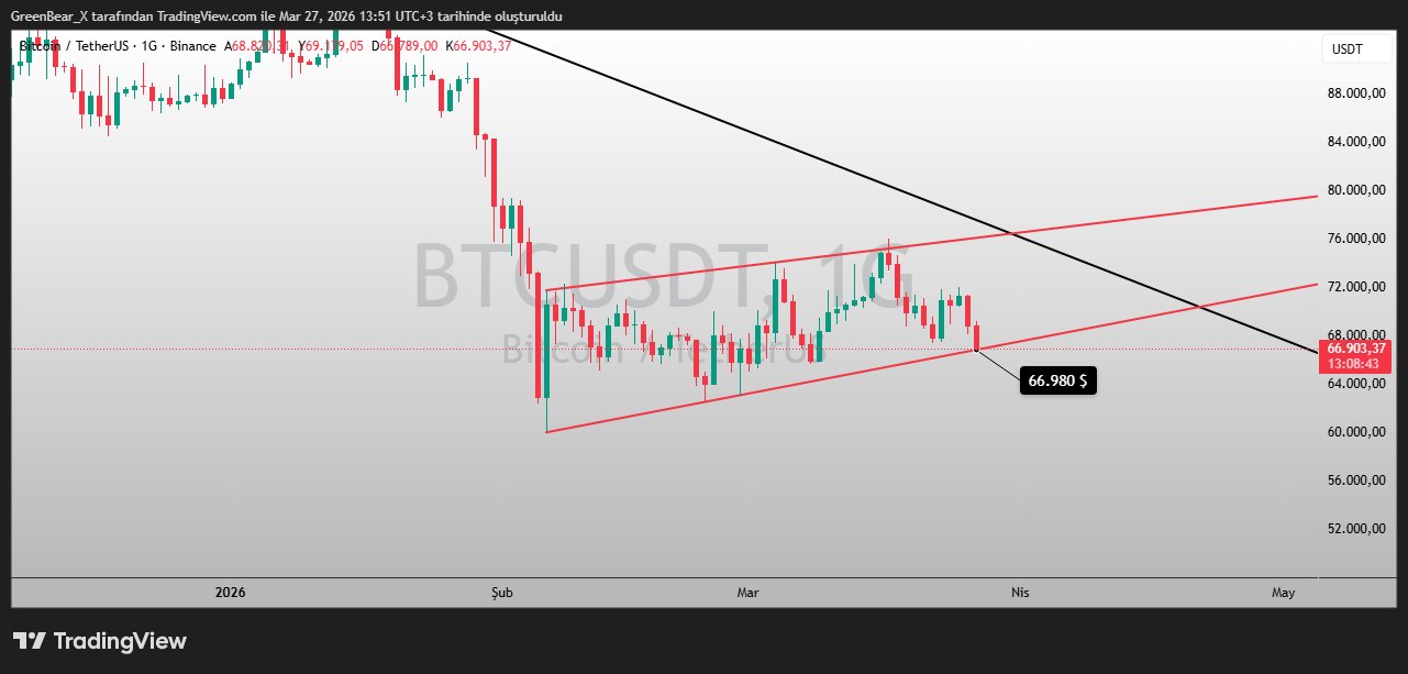 💔 $BTC yükselen kanal yapısını sürdüremedi ➡️Fiyat tekrar kanal alt bandının altına sarktı. Yukarıda konuştuğum 72k ve 75k likidasyon bölgelerini temizlemeye de gitmedi. 72k seviyesine kadar bir yükseliş geldi ama oradaki likiditenin yalnızca çok küçük bir kısmını aldıktani çekildi. Bu hareketi fib seviyeleriyle incelediğimizde düşüşü destekleyen bir tablo görüyoruz. Çünkü tepki yükselişi tam olarak 0.5 fib seviyesine kadar ulaştı. Bu da genelde aşağı yönlü devam eden hareketlerde gördüğümüz bir yapı.👇 Daha geniş resimde ise durum malesef kötü. Grafikte bir kama oluşumu var ve bu formasyonun hedefi aşağı yönlü oluyor. Kırılım gelirse teknik olarak 60k seviyelerine kadar geri çekilebiliriz. #kriptopara #bitcoin #altcoins
