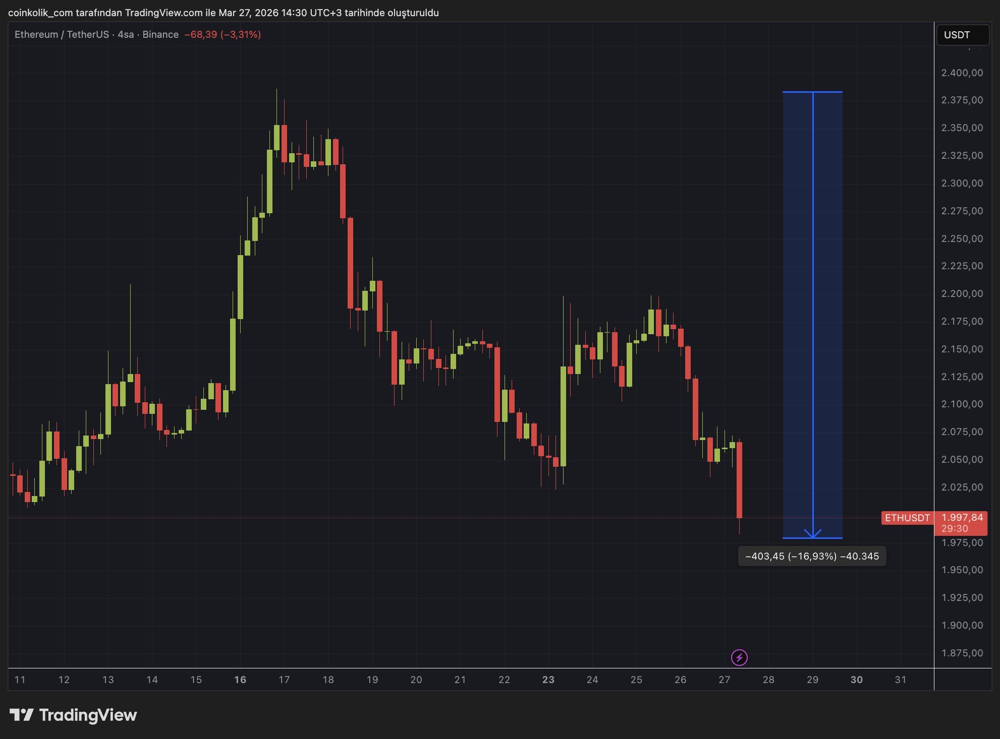 #Ethereum 2.000 doların altına düştü.👀 Diyorum, acele etmeyin sabredin 1000-1200 USD aralığında toplayın, daha erken.. shorta devam kardeşler, olası yükselişler SAT fırsatıdır.. Dönüşü ben SÖYLEYECEĞİM !! �� #kriptoparwc