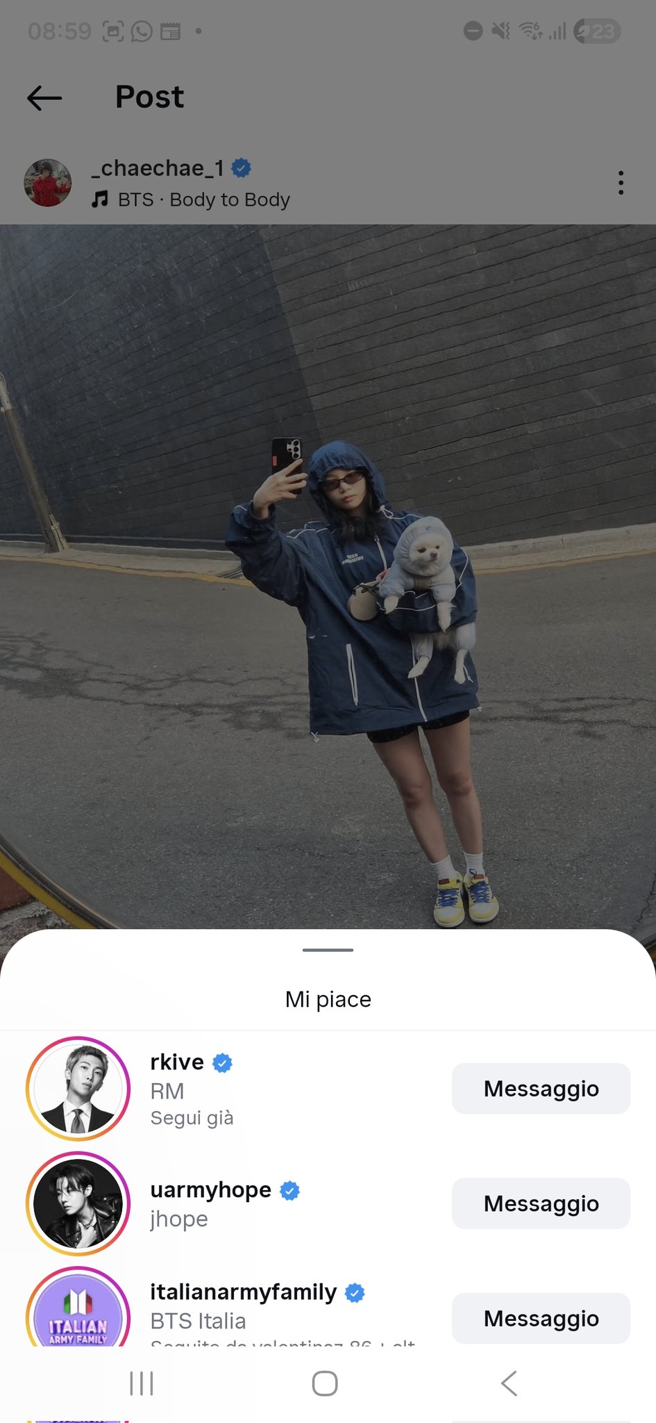 LE_SSERAFIM_ITALIA 🇮🇹 🍝 @le_sserafim_ita · 4h 🔷🔎 RM dei BTS ha messo like al post Instagram di CHAEWON in cui indossa la giacca del merch dei BTS con "Body To Body" come audio 💙🔥 #LE_SSERAFIM #르세라핌 #KIMCHAEWON #김채원 #BTS #KEEPSWIMMING #BTS_ARIRALlN 142