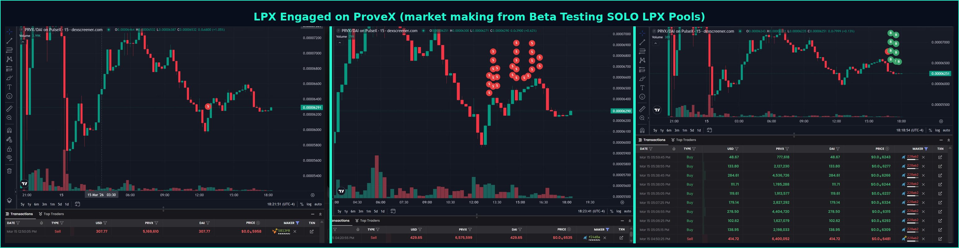 The image shows some recent LPX market activity on the ProveX token.