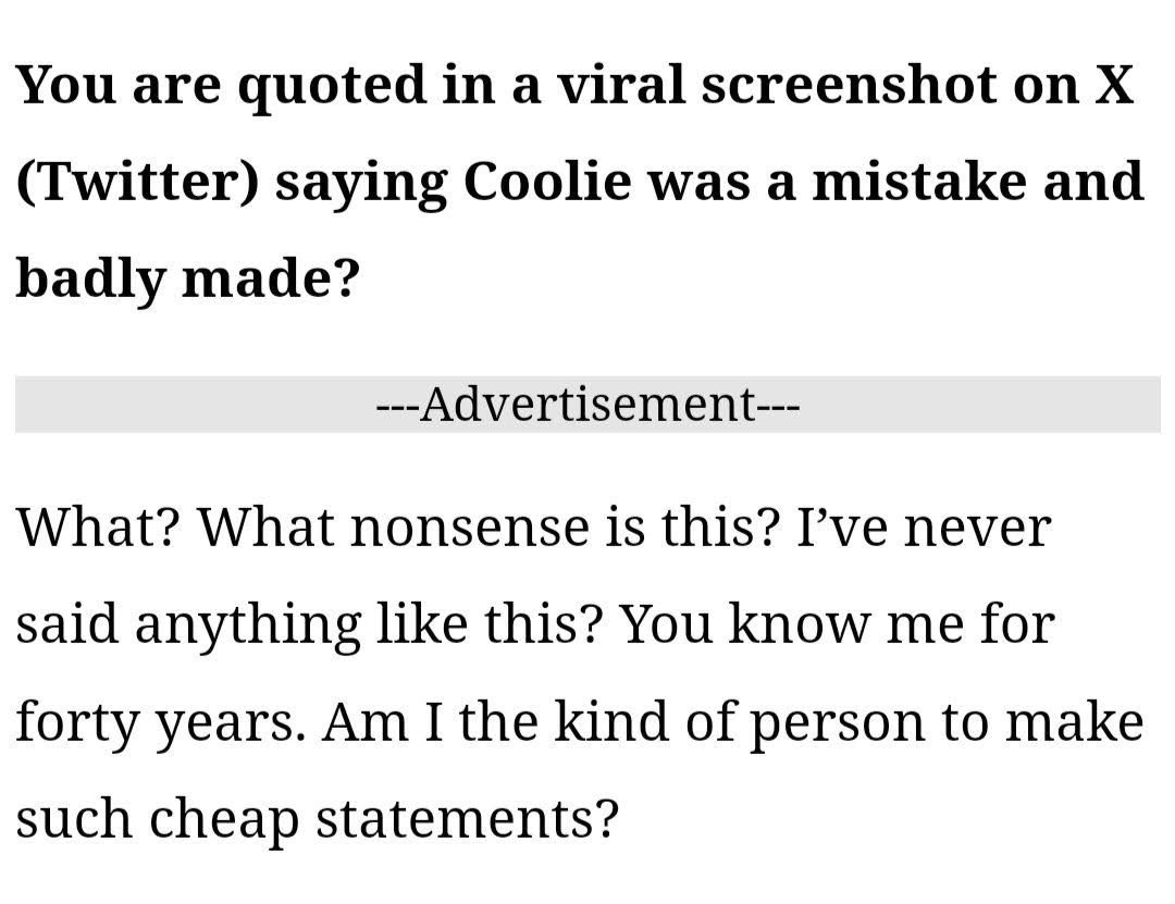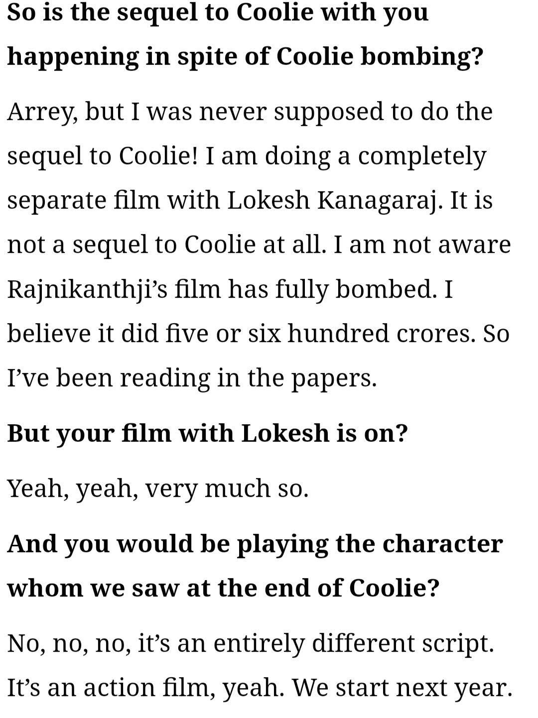 Thalaivar 🔥 🔥 @thalaivar75 · Sep 14, 2025 #AamirKhan latest interview.. His movies with #Lakesh still on.. He's doing it next year and it's not a sequel to #Coolie.. He also confirmed he never said anything negative about how he acted in Coolie.. 1 2 196