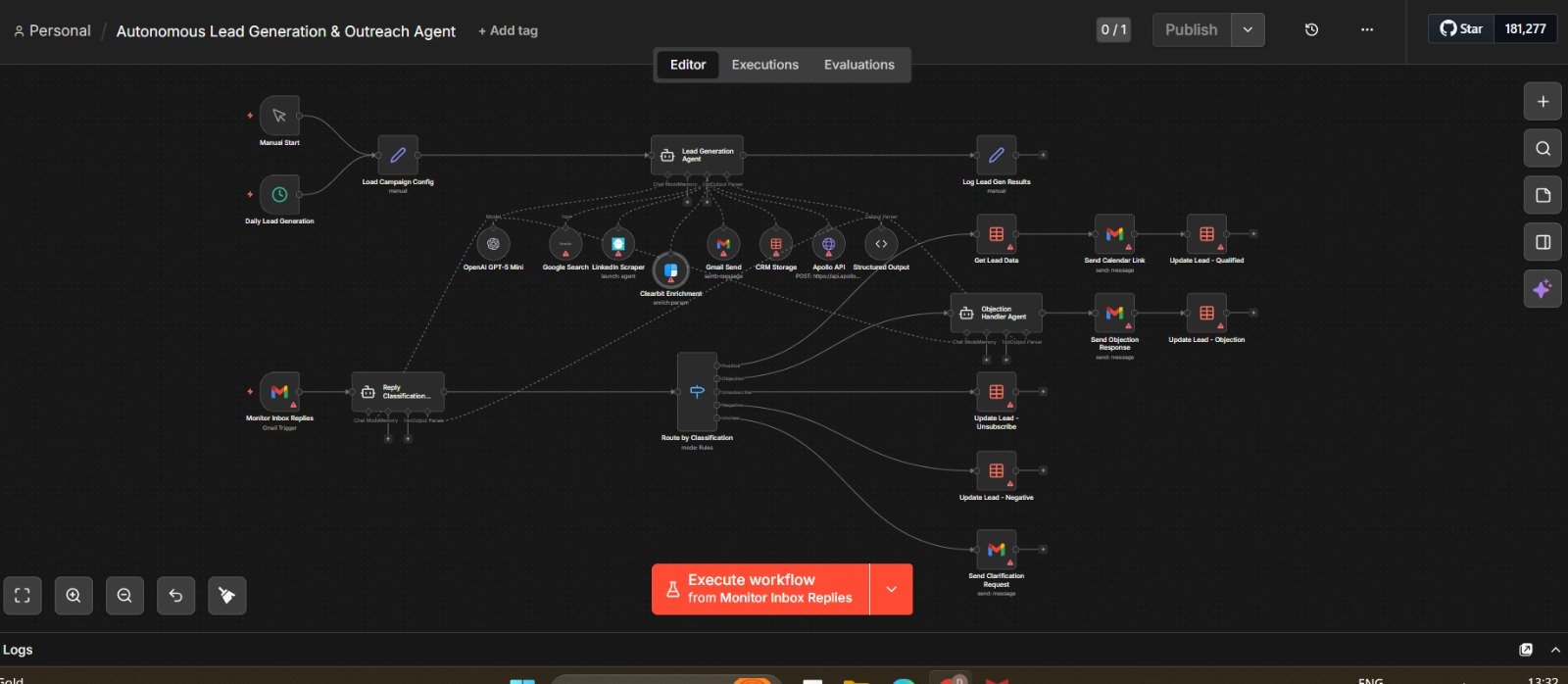 Built an autonomous outbound agent in n8n that finds high-intent leads, writes personalized emails, handles replies, and books calls—end to end. No manual grind, just pipeline on repeat. Want it? DM “AGENT”. #SaaS#LeadGen#ColdEmail#AIagents#n8n#B2B#StartupGrowth