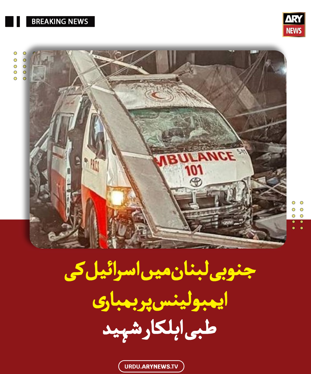 جنوبی لبنان میں اسرائیل کی ایمبولینس پر بمباری، طبی اہلکار شہید