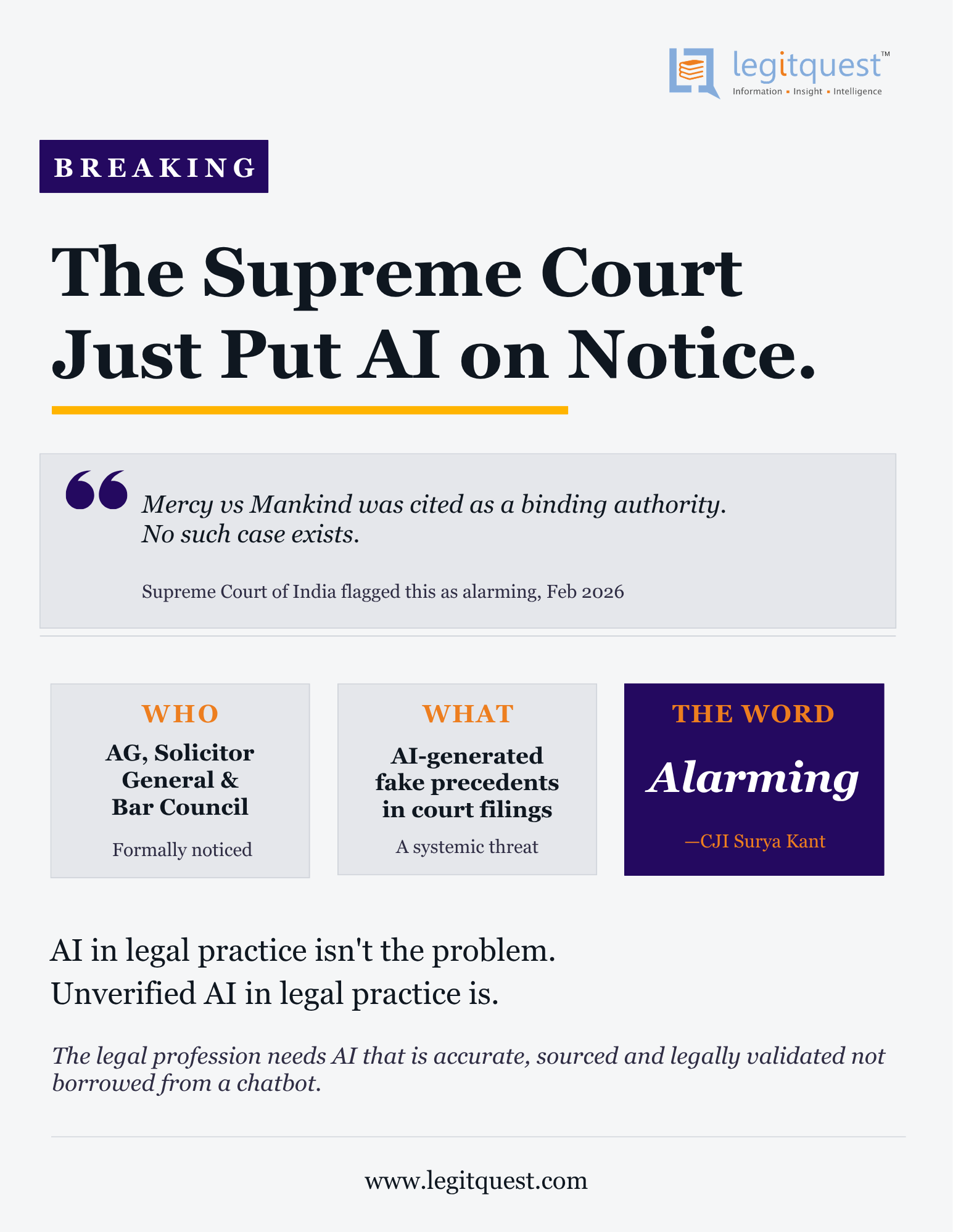 A petition cited "Mercy vs Mankind." No such case exists. The Supreme Court called AI-generated fake precedents #ALARMING. AI that fills gaps with confidence is dangerous in a courtroom. Legal AI needs verified sources. That's what we build. #LegalAI #AIHallucinations #LegalTech