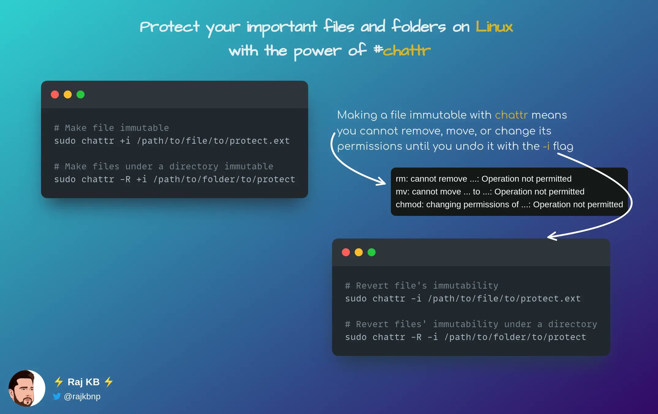 Protect your important files and folders on #Linux with the power of #chattr 💻🔒👇 Elevate your security game by setting immutability flags with just a simple command! #LinuxTip 🐧😎 Say goodbye to accidental deletion and hello to peace of minlgRClj