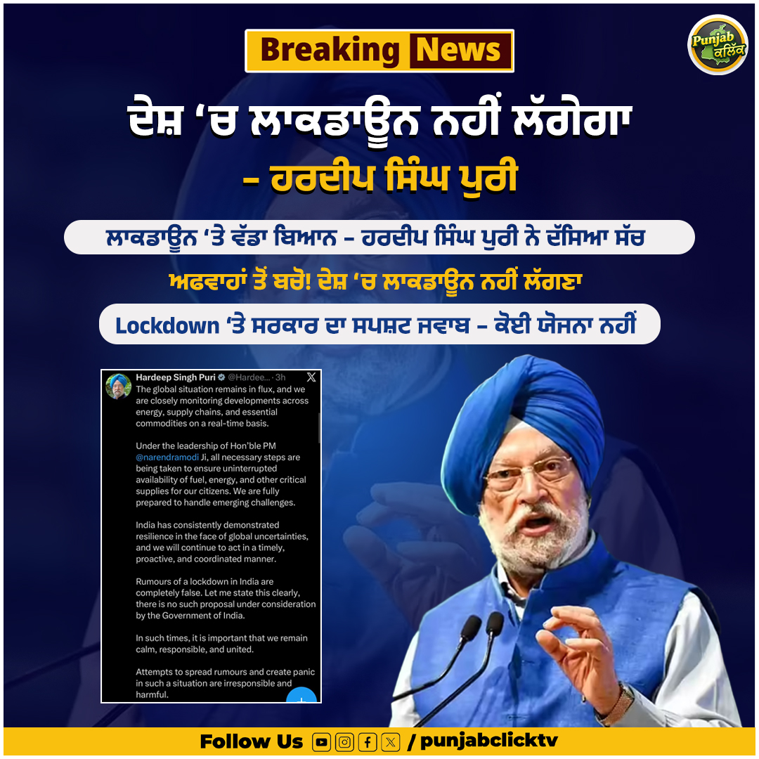 From bharatidea.comHardeep Puri on Lockdown: लॉकडाउन लगने की खबरों को सुनकर लोग पैनिक हो रहे हैं और जरूरी सामान खरीद रहे हैं. इस पर केंद्रीय पेट्रोलियम और प्रकृतिक गैस मंत्री हरदीप सिंह पुरी ने जवाब दिया है.