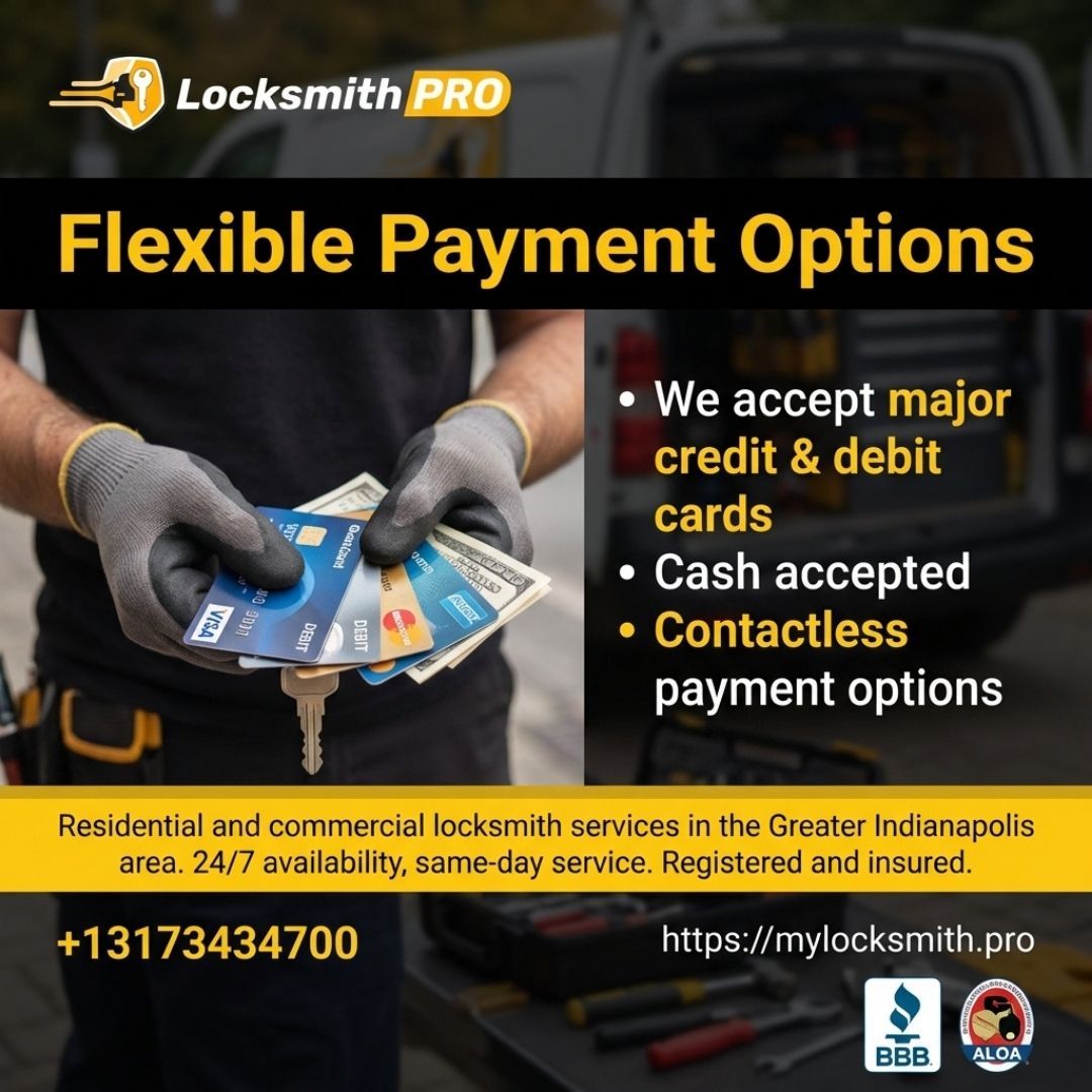 Locksmith Pro offers affordable, flexible payment options for expert residential and commercial locksmith services in Greater Indianapolis and nearby towns—your trusted, insured security partner. #LocksmithPro #Indianapolis #AffordableService #LockChange #Rekey