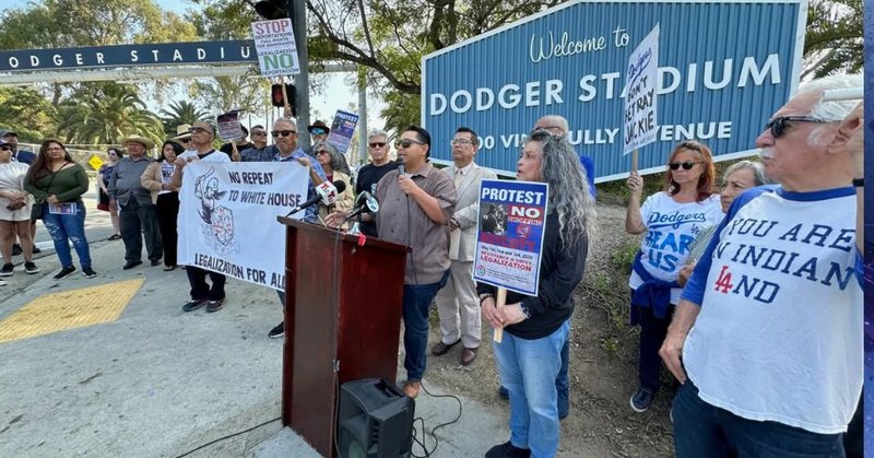 Líderes de la comunidad, activistas y miembros de la comunidad se juntaron afuera del Estadio de Los Dodgers para urgir al equipo de casa a no acudir a la Casa Blanca para reunirse con el presidente...