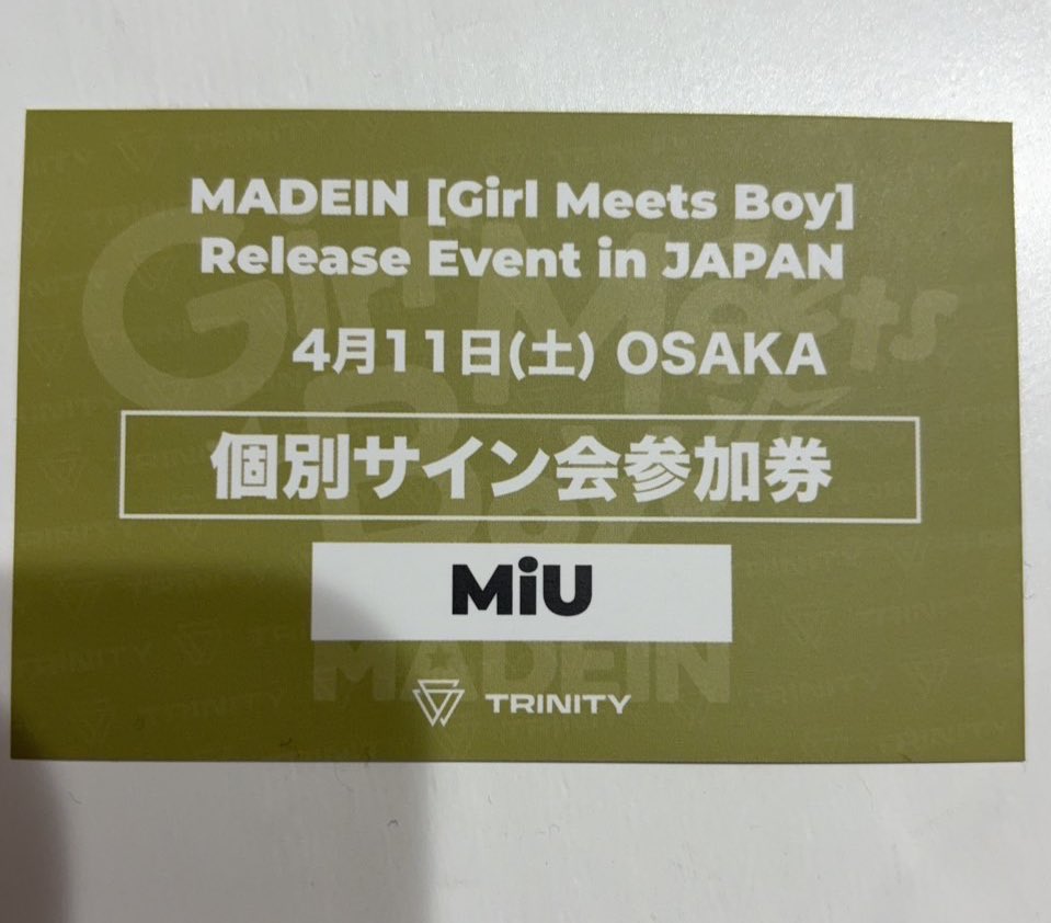 ノコ @xxxito83 · 19h MADEIN リリースイベント TRINITY 大阪 4/11 人数が集まれば、個別サイン会を4セット当日購入したいと思っています。 【譲】個別サイン会 マシロ ミユ ナゴミ 【求】 買取 DMまでお願いいたします 🙇🏻♀️💭 #MADEIN #MADEIN交換 304