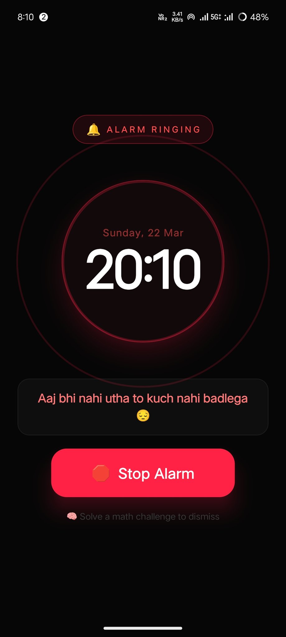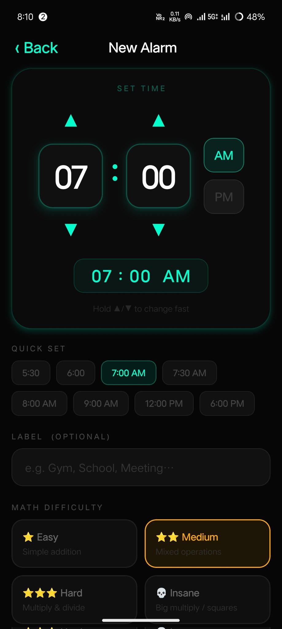 Solve a math challenge to stop the alarm Choose difficulty (Easy → Insane ) Custom tones & meme styles.