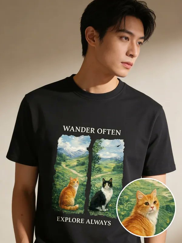 🐱✨ Playera con estampado de gatos viajeros ✨🐱 Dos gatos curiosos recorren paisajes llenos de magia y aventura. 🌍💫