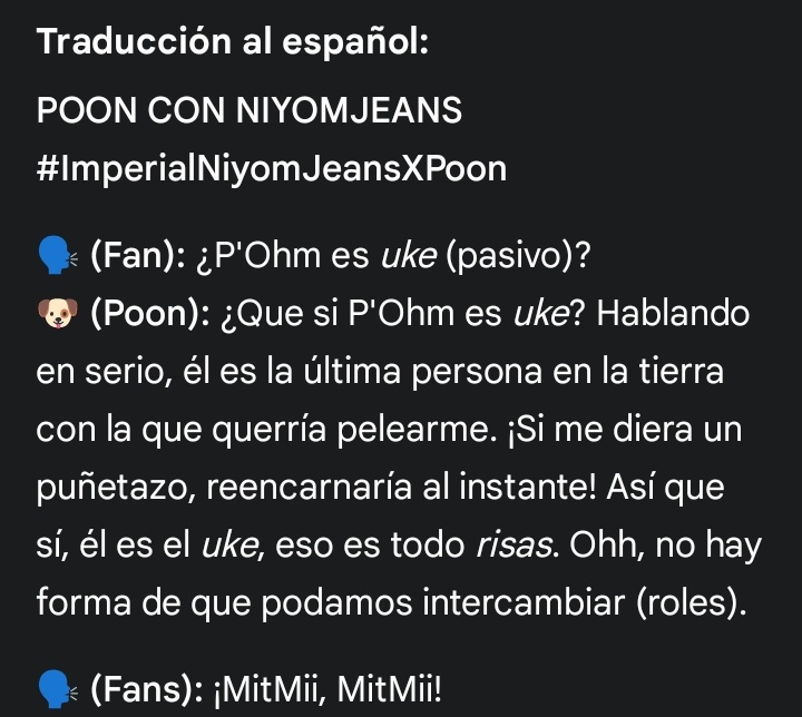 🐶: Is P'Ohm an uke? Seriously, he's the last person on earth I'd ever want to pick a fight with. If he punched me, I'd be reborn instantly! So (he) is uke, that's it *laughs* Ohh, there's no way we can swap (roles)