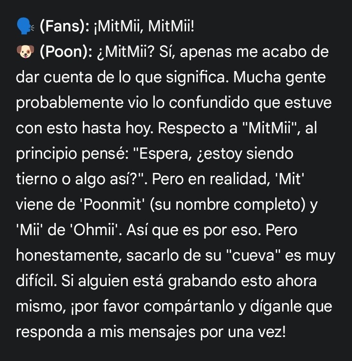 🐶: MitMii? Yeah, I only just realised what that meant. A lot of people probably saw how confused I've been about this until today. Regarding MitMii, at first, I thought, "Wait, am I being cute or something?" But actually, 'Mit' comes from 'Poonmit', and 'Mii' from "Ohmii." So it's like that. But honestly, dragging him out of his cave is so hard. If anyone is filming this right now, please share it and tell him to please reply to my messages for once!